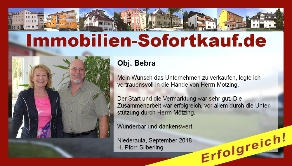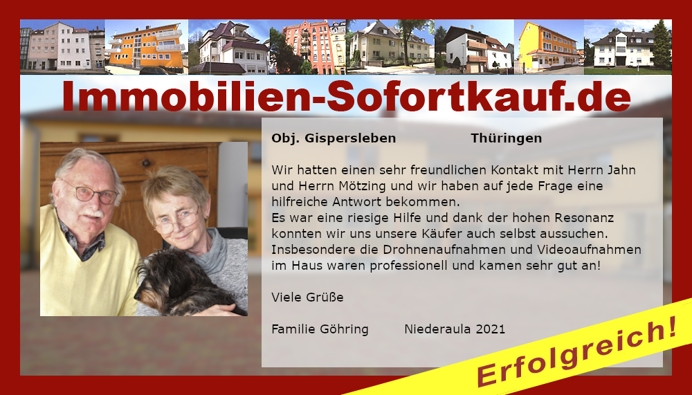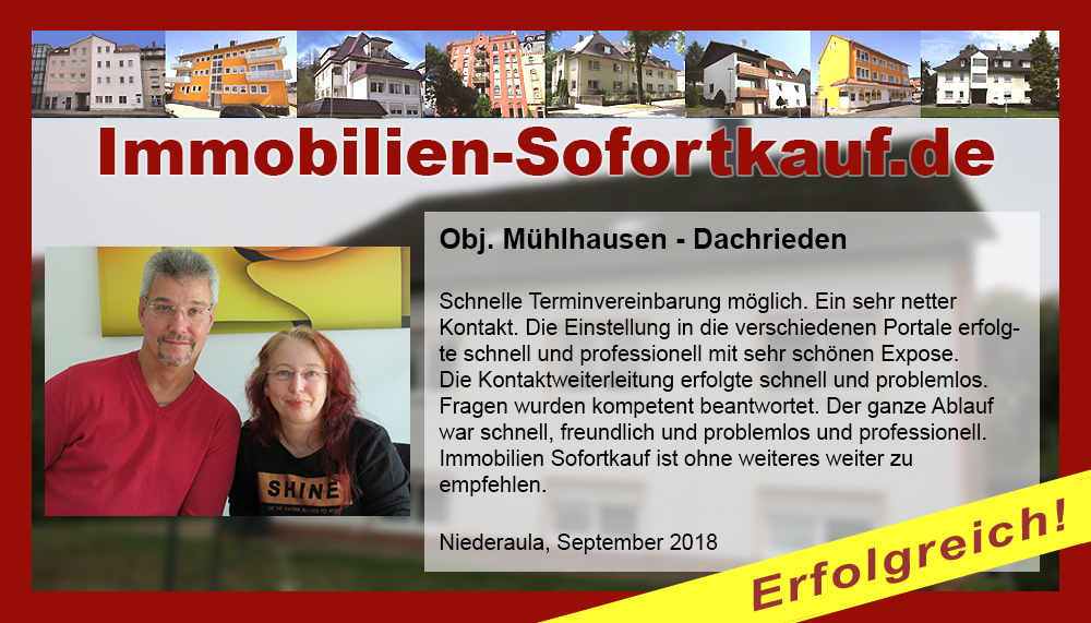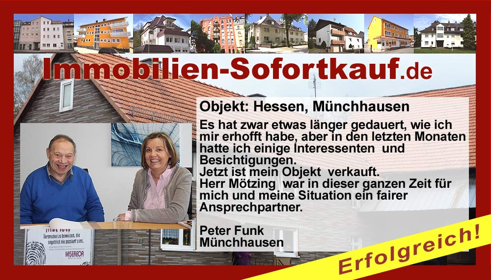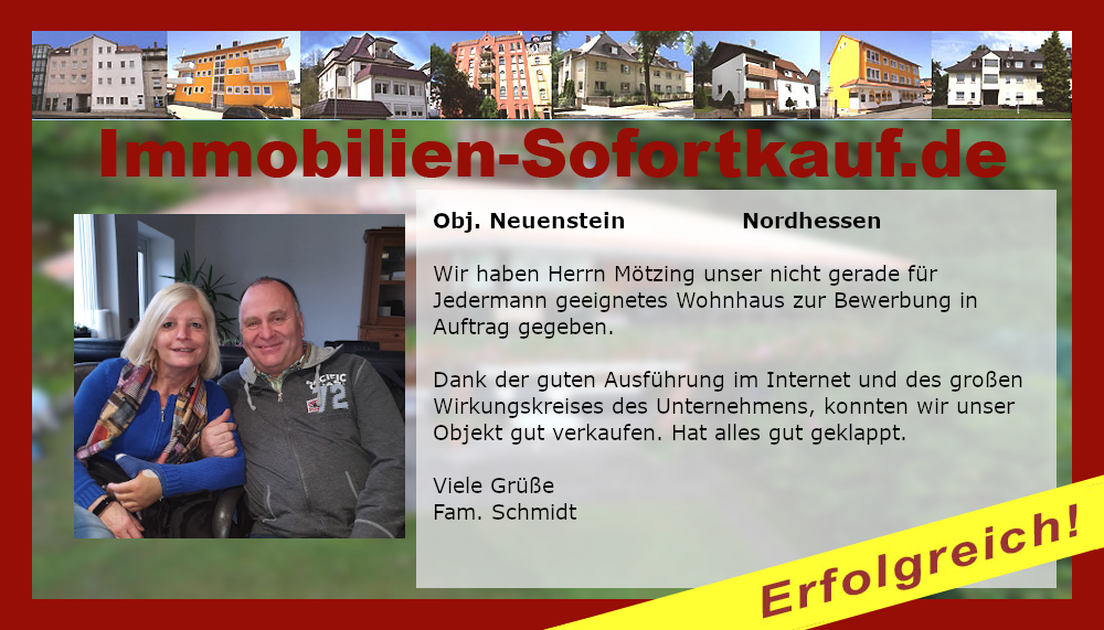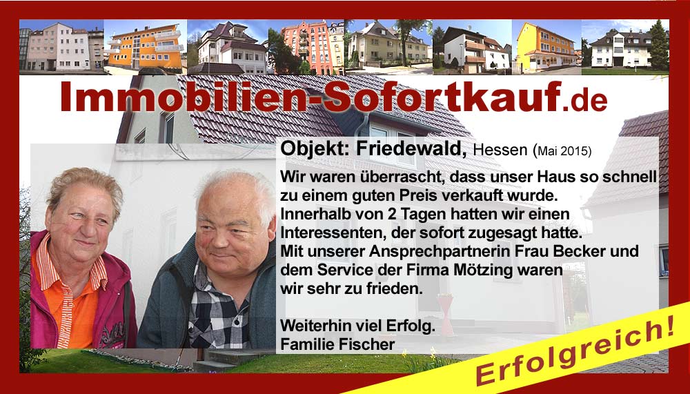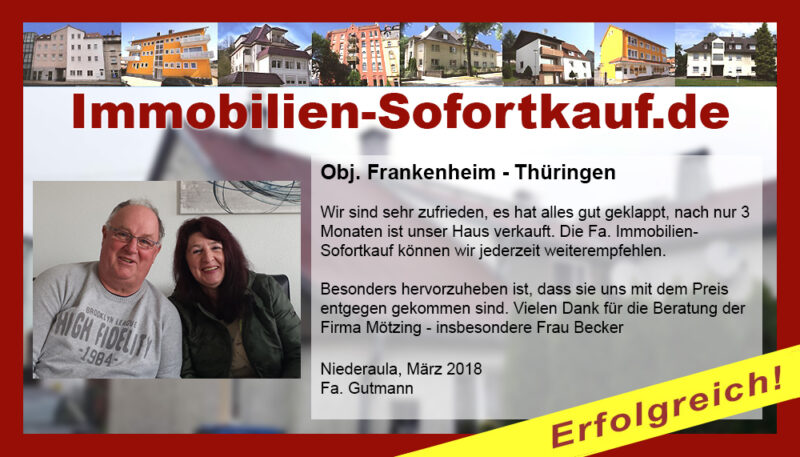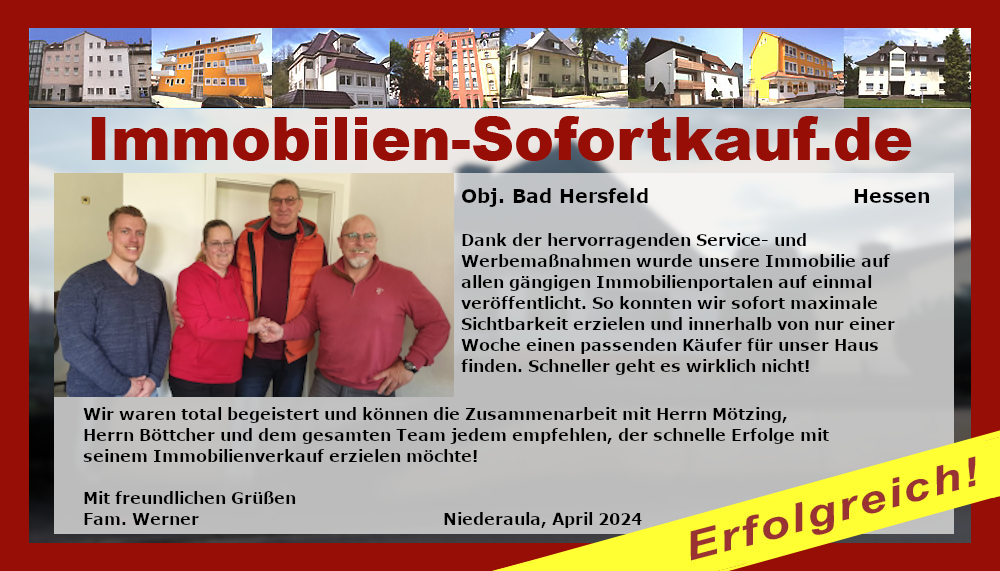 Wir sind sehr zufrieden, es hat alles gut geklappt, nach nur 3 Monaten ist unser Haus verkauft. Die Fa. Immobilien-Sofortkauf können wir jederzeit weiterempfehlen. Besonders hervorzuheben ist, dass sie uns mit dem Preis entgegen gekommen sind. Vielen Dank für die Beratung der Firma Mötzing - insbesondere Frau Becker Niederaula, März 2018 Fa. Gutmann