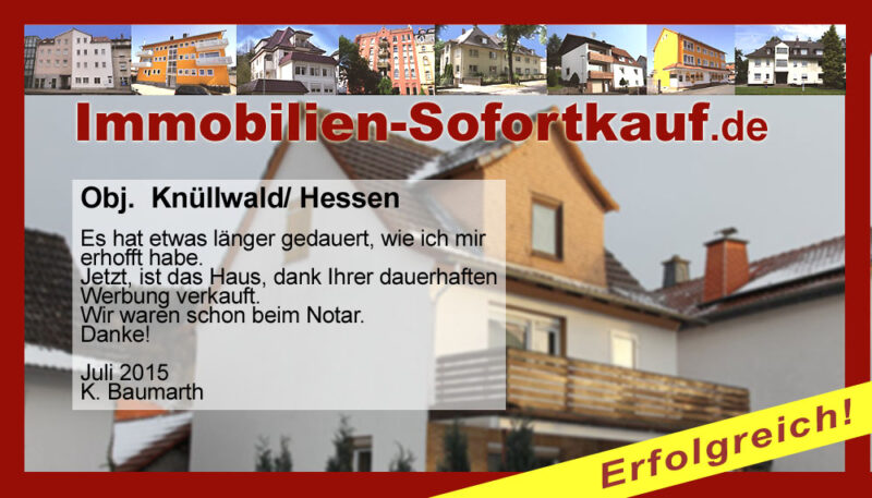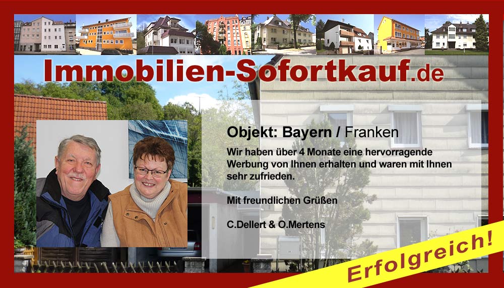 Es hat etwas länger gedauert, wie ich mir erhofft habe. Jetzt, ist das Haus, dank Ihrer dauerhaften Werbung verkauft. Wir waren schon beim Notar. Danke! Juli 2015 K. Baumarth
