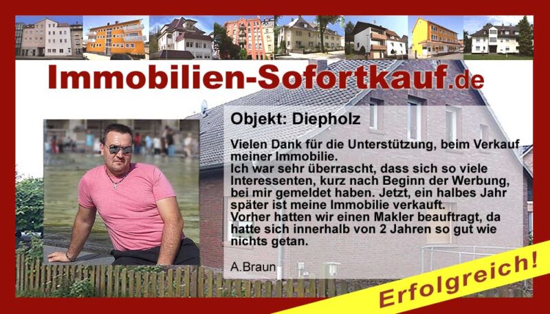 Vielen Dank für die Unterstützung, beim Verkauf meiner Immobilie. Ich war sehr überrascht, dass sich so viele Interessenten, kurz nach Beginn der Werbung, bei mir gemeldet haben. Jetzt, ein halbes Jahr später ist meine Immobilie verkauft. Vorher hatten wir einen Makler beauftragt, da hatte sich innerhalb von 2 Jahren so gut wie nichts getan. A.Braun