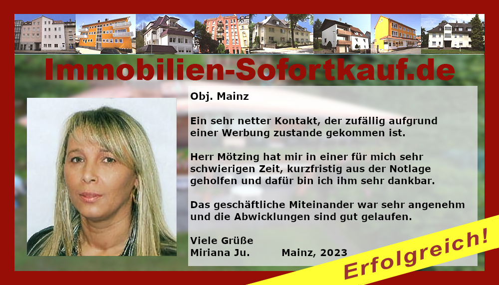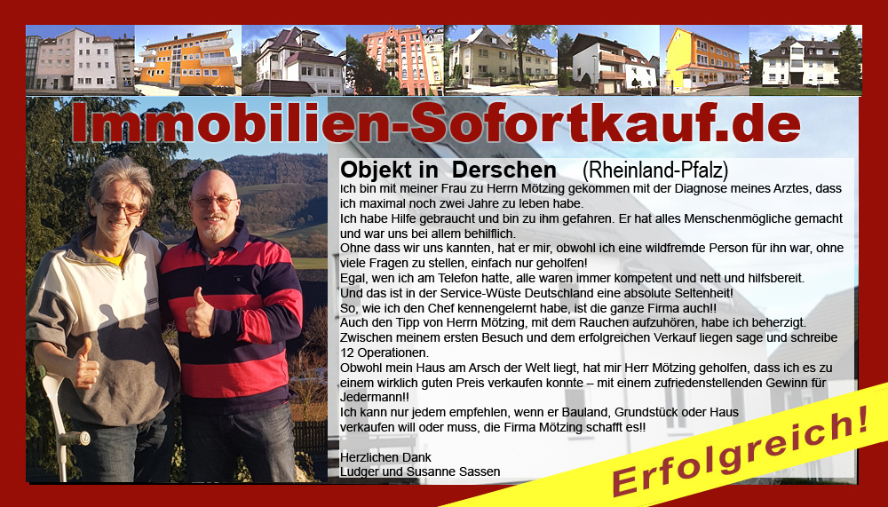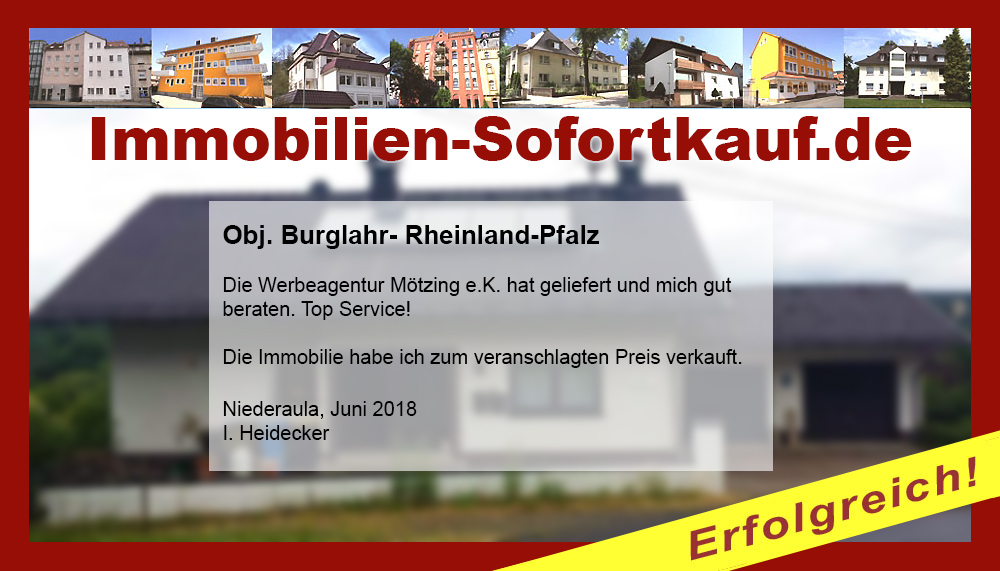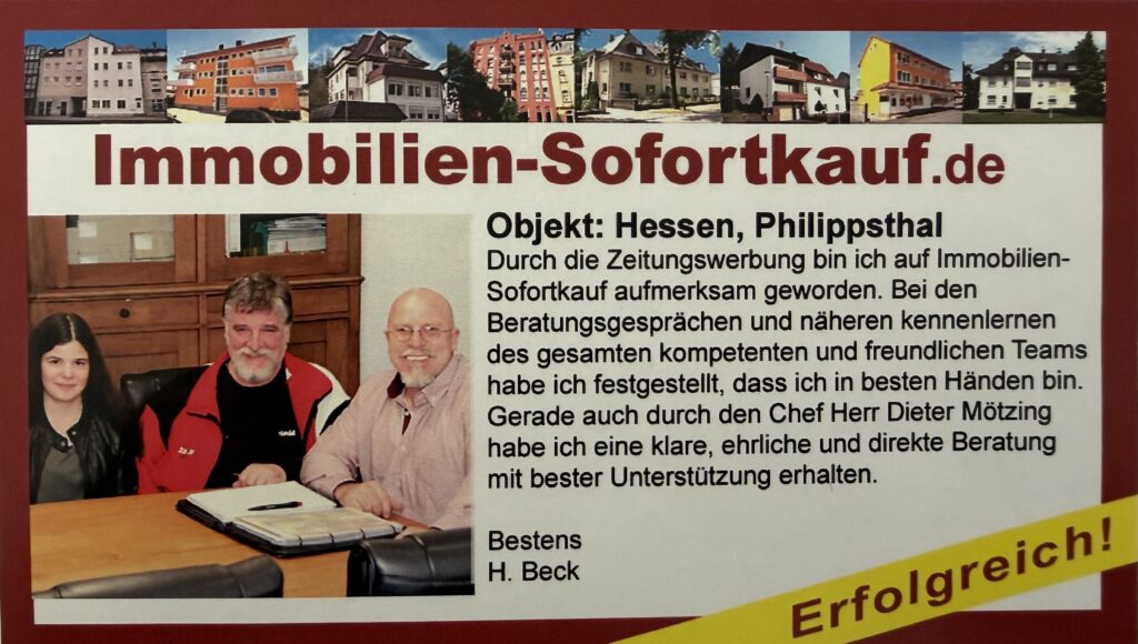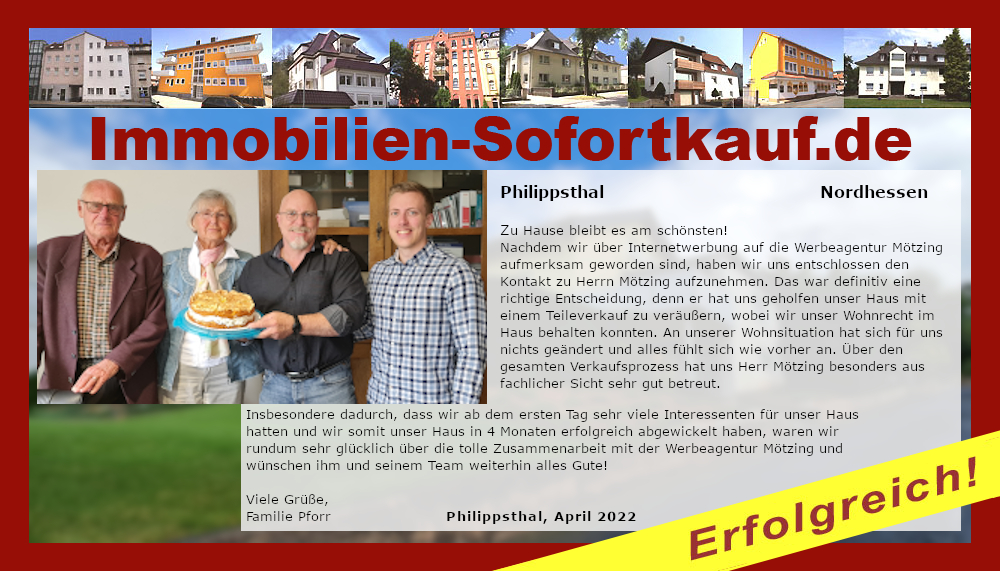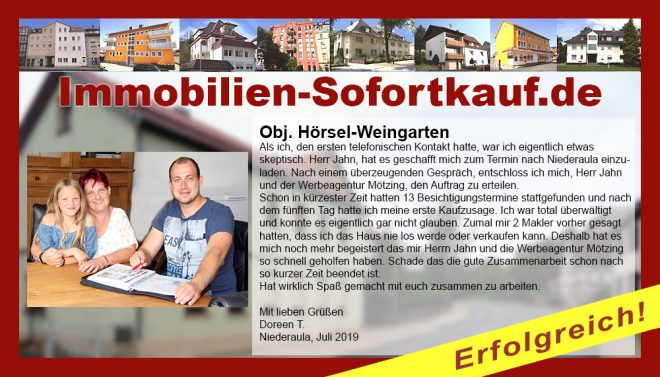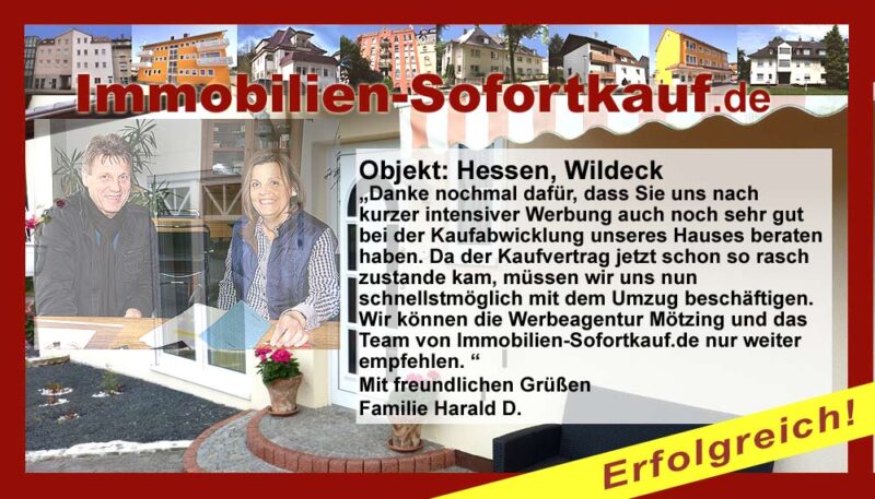 „Danke nochmal dafür, dass Sie uns nach kurzer intensiver Werbung auch noch sehr gut bei der Kaufabwicklung unseres Hauses beraten haben. Da der Kaufvertrag jetzt schon so rasch zustande kam, müssen wir uns nun schnellstmöglich mit dem Umzug beschäftigen. Wir können die Werbeagentur Mötzing und das Team von Immobilien-Sofortkauf.de nur weiter empfehlen.“ Mit freundlichen Grüßen Familie Harald D.