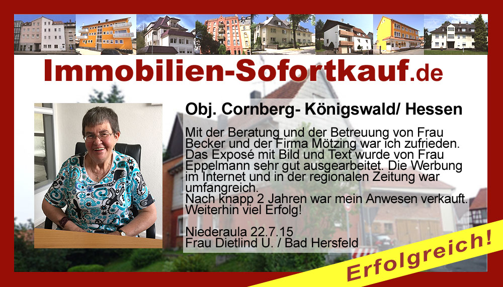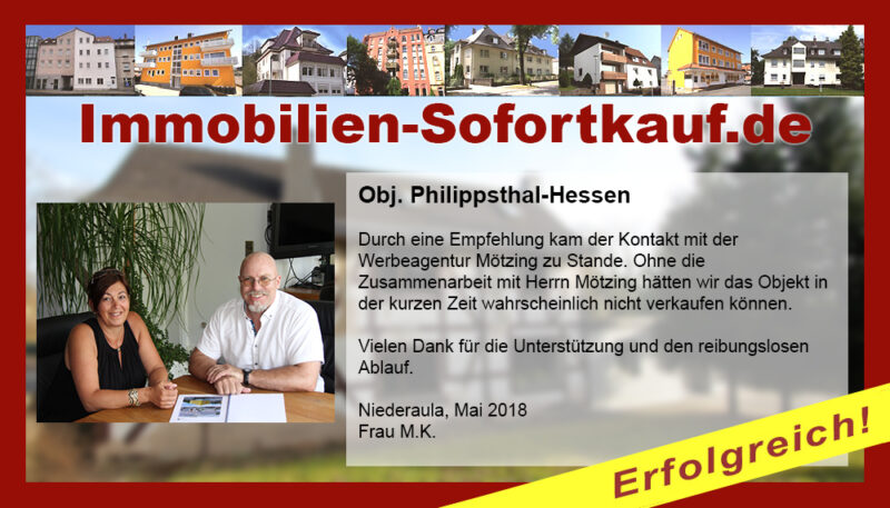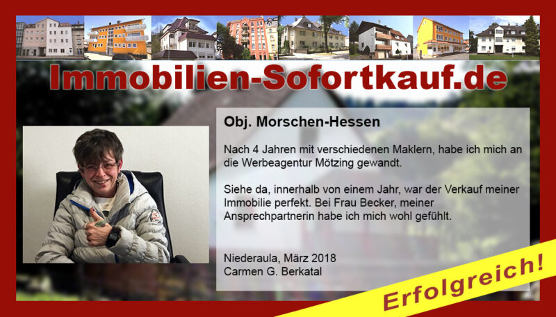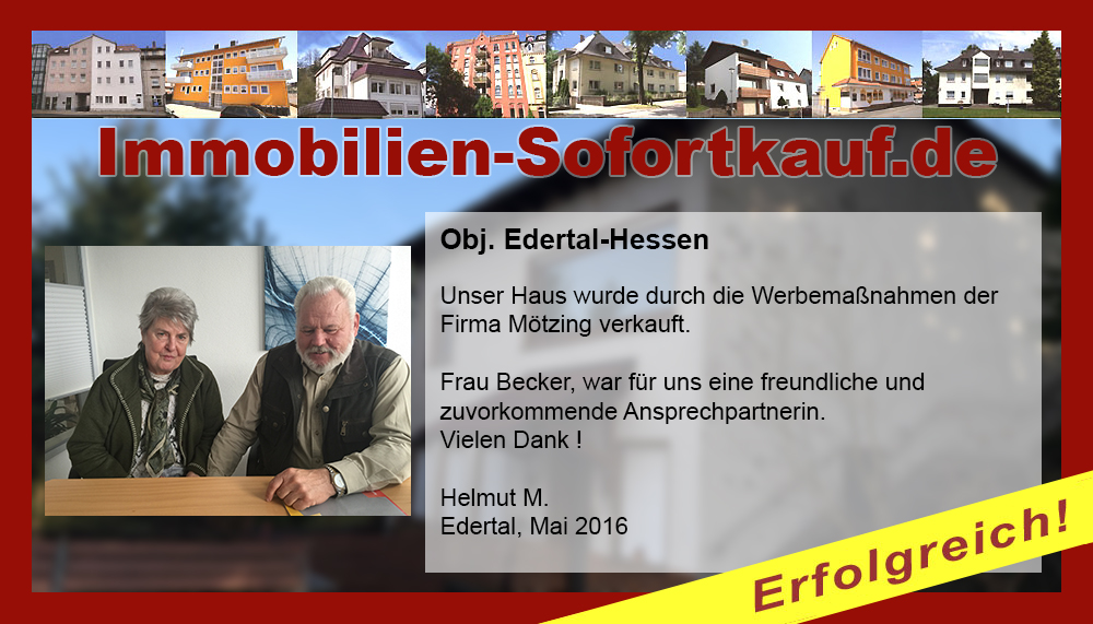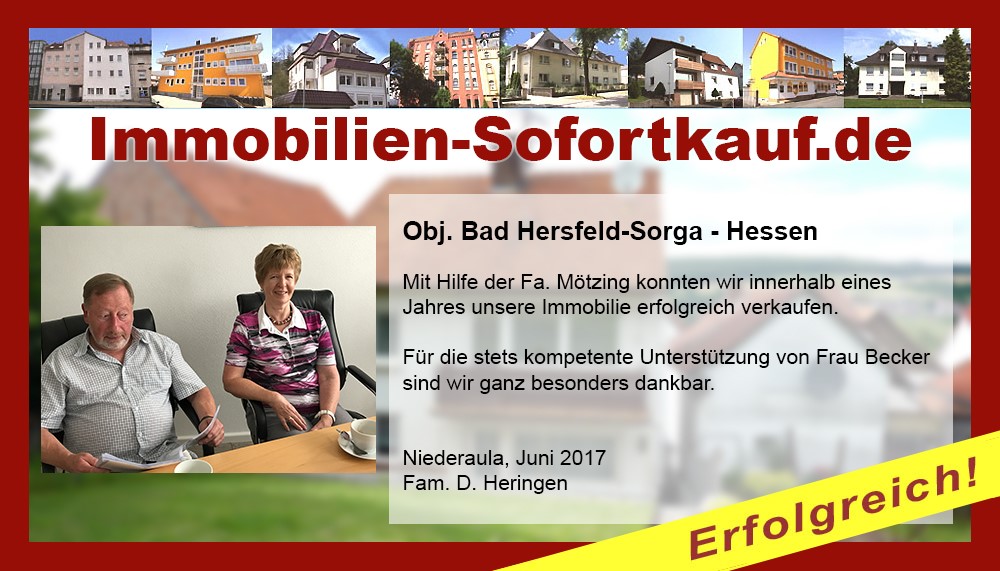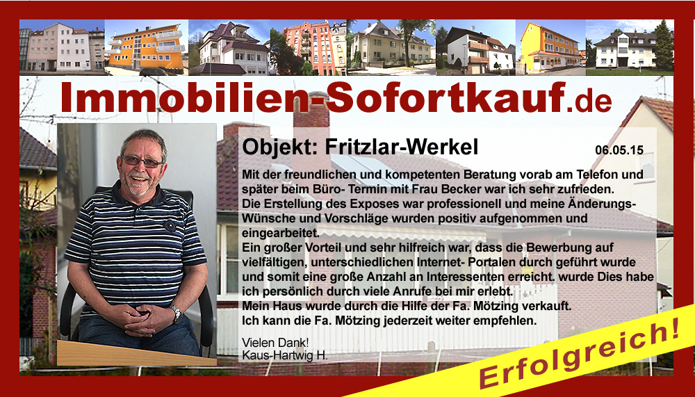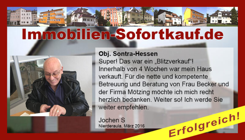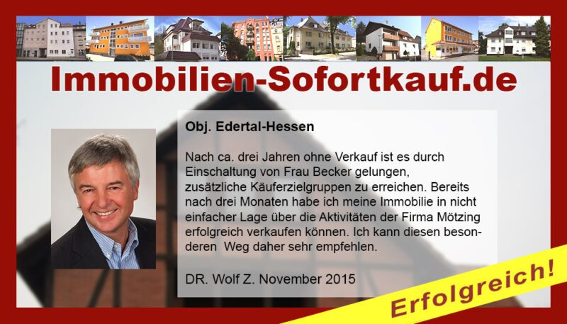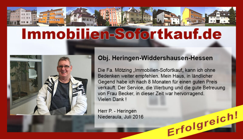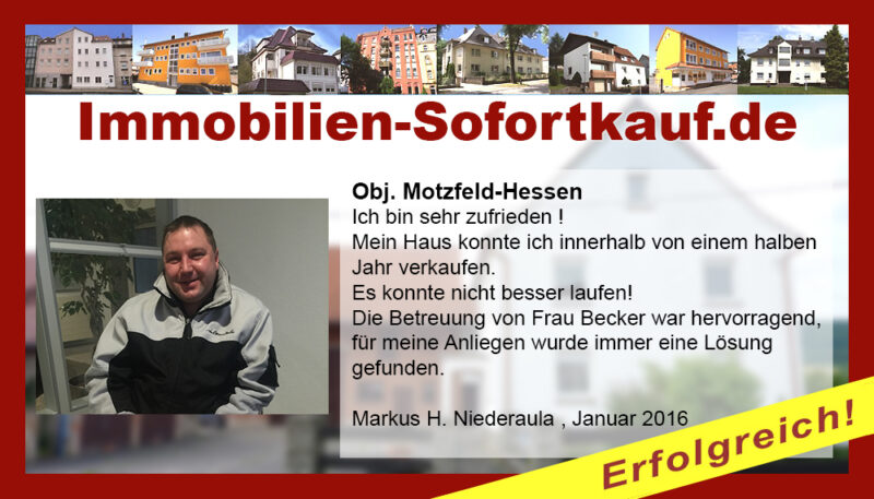 Die Fa. Mötzing „Immobilien-Sofortkauf“, kann ich ohne Bedenken weiter empfehlen. Mein Haus, in ländlicher Gegend habe ich nach 8 Monaten für einen guten Preis verkauft. Der Service, die Werbung und die gute Betreuung von Frau Becker, in dieser Zeit war hervorragend. Vielen Dank! Herr P. – Heringen Niederaula, Juli 2016