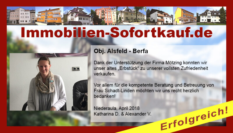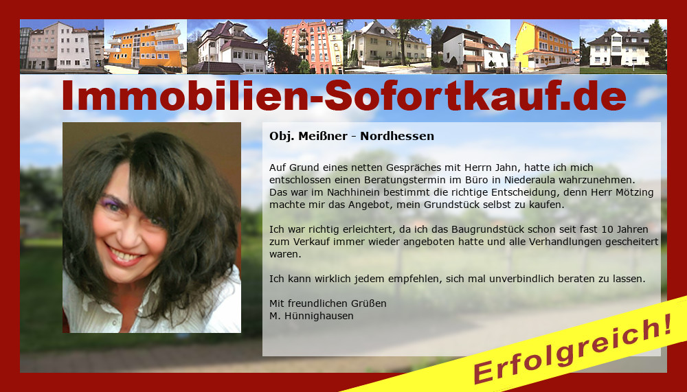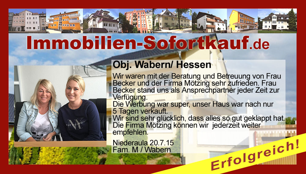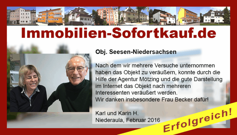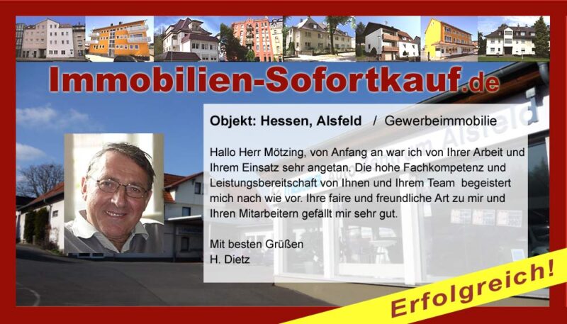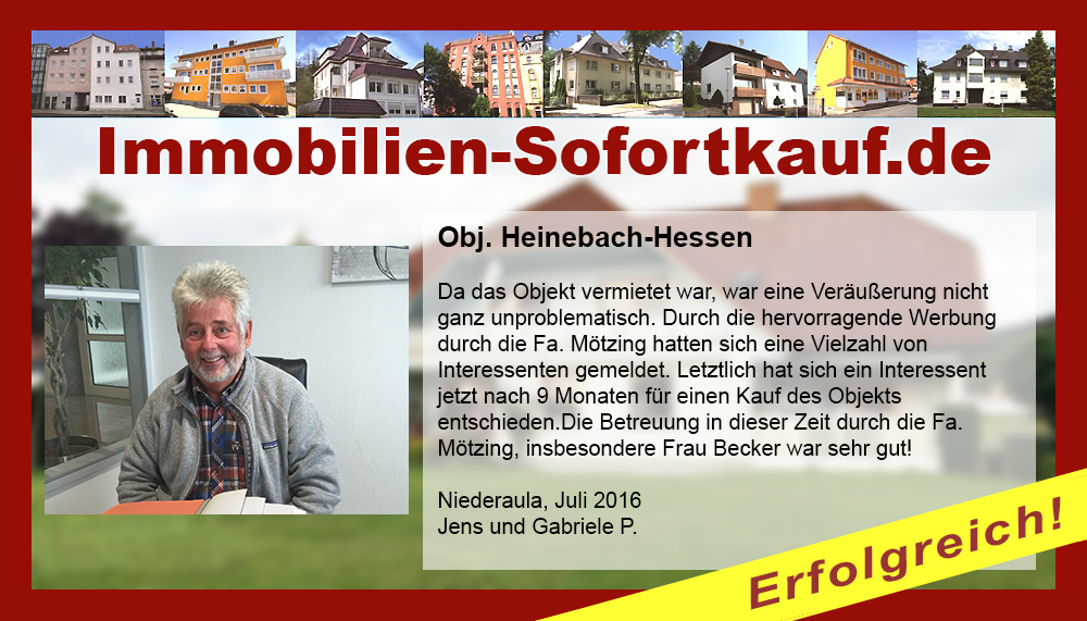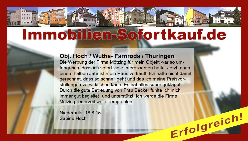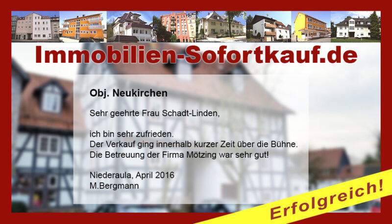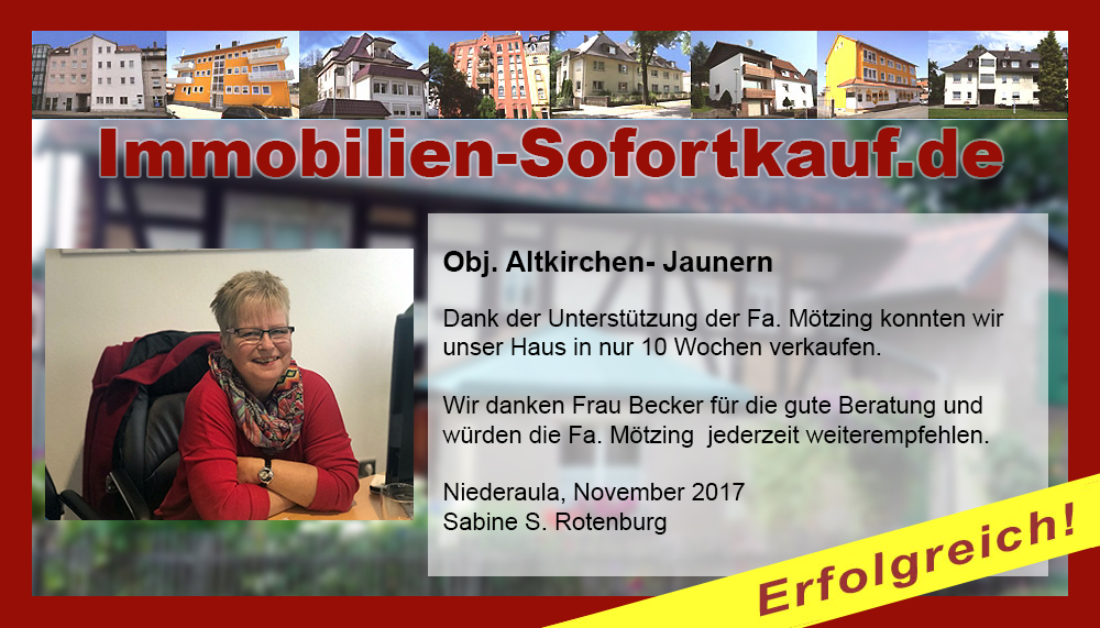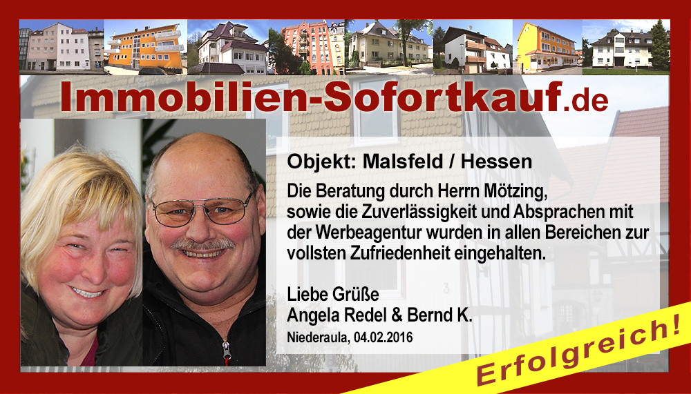 Die Fa. Mötzing „Immobilien-Sofortkauf“, kann ich ohne Bedenken weiter empfehlen. Mein Haus, in ländlicher Gegend habe ich nach 8 Monaten für einen guten Preis verkauft. Der Service, die Werbung und die gute Betreuung von Frau Becker, in dieser Zeit war hervorragend. Vielen Dank! Herr P. – Heringen Niederaula, Juli 2016