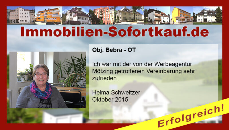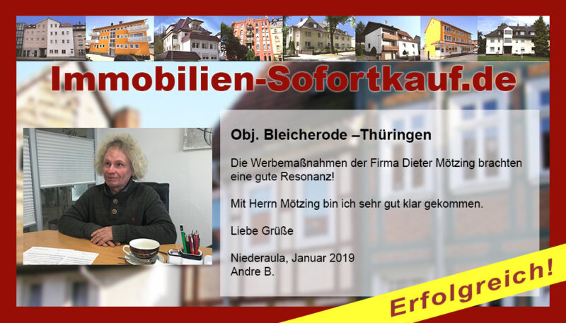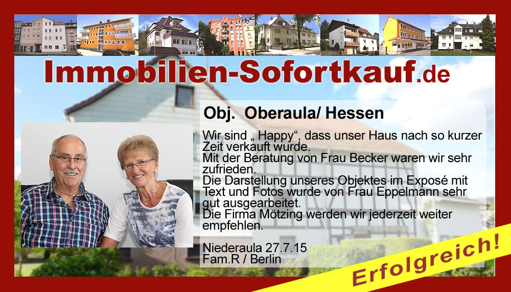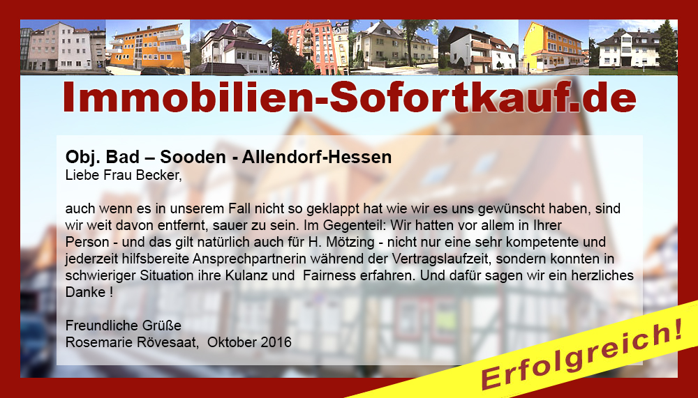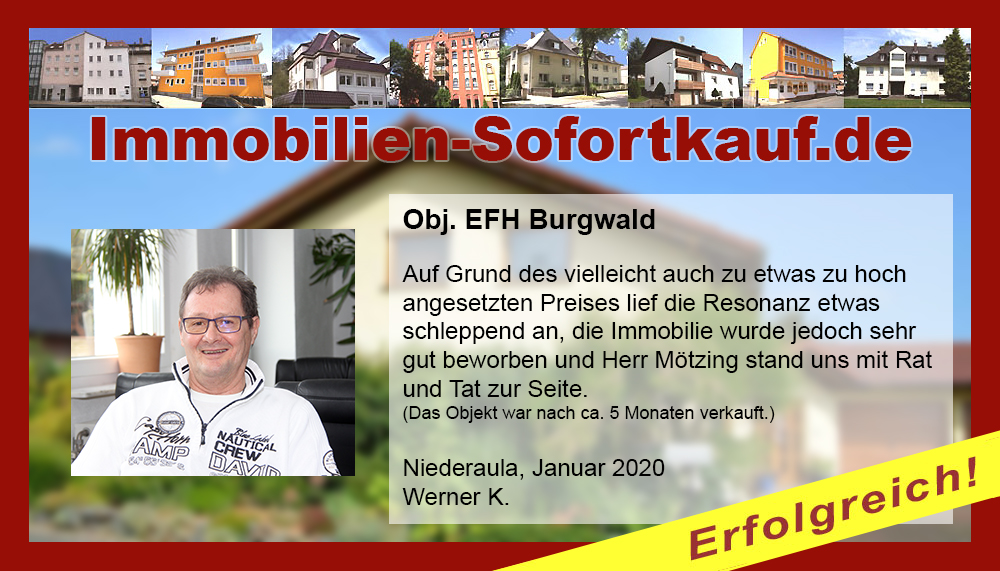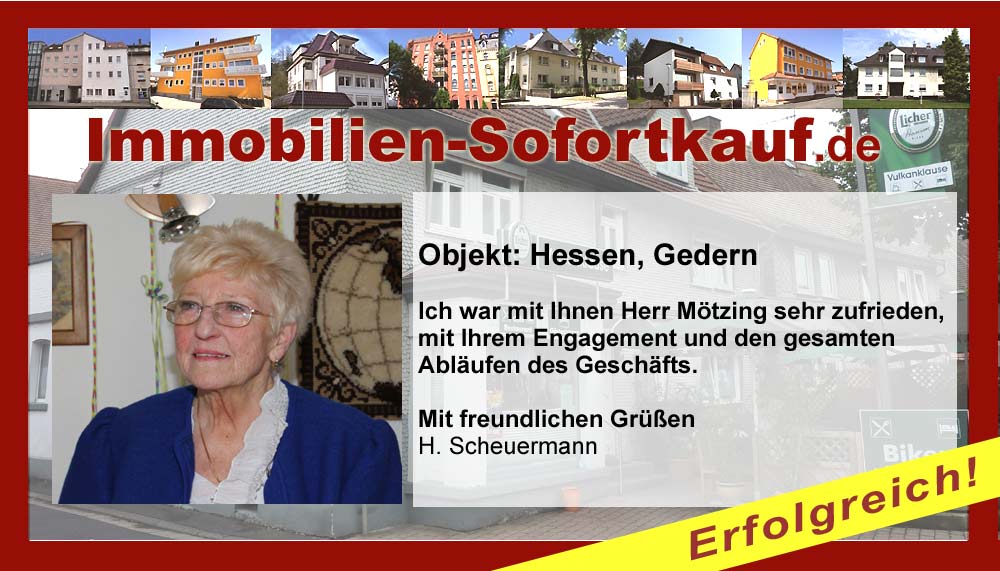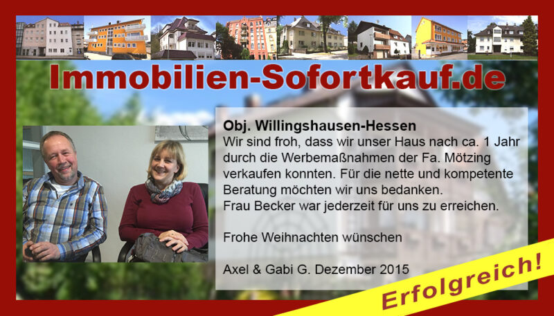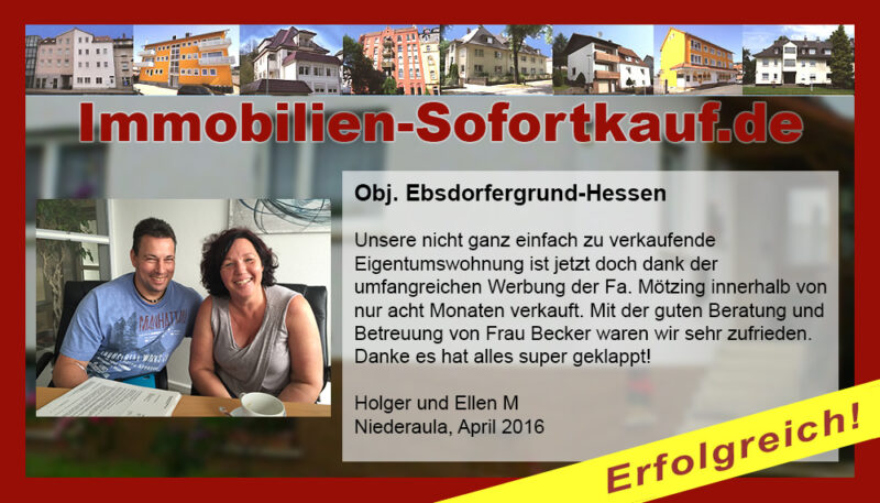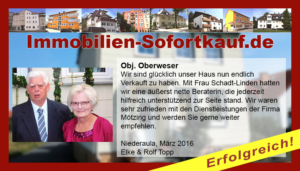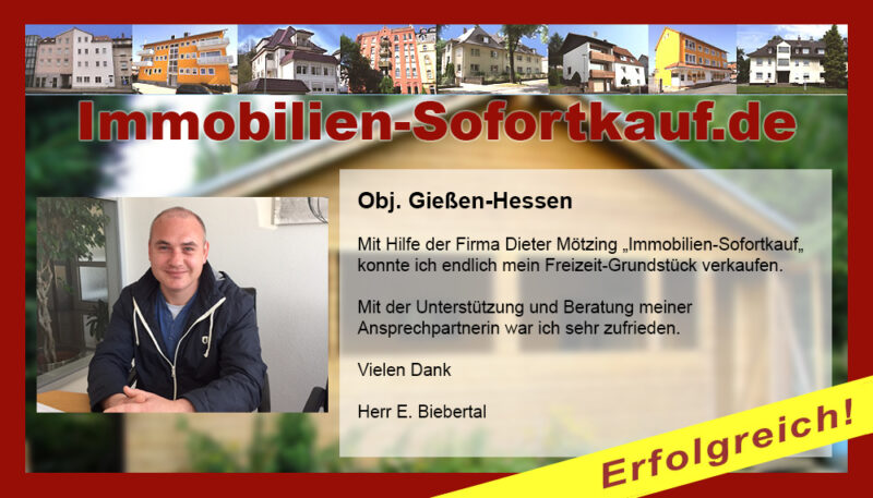 Die Fa. Mötzing „Immobilien-Sofortkauf“, kann ich ohne Bedenken weiter empfehlen. Mein Haus, in ländlicher Gegend habe ich nach 8 Monaten für einen guten Preis verkauft. Der Service, die Werbung und die gute Betreuung von Frau Becker, in dieser Zeit war hervorragend. Vielen Dank! Herr P. – Heringen Niederaula, Juli 2016
