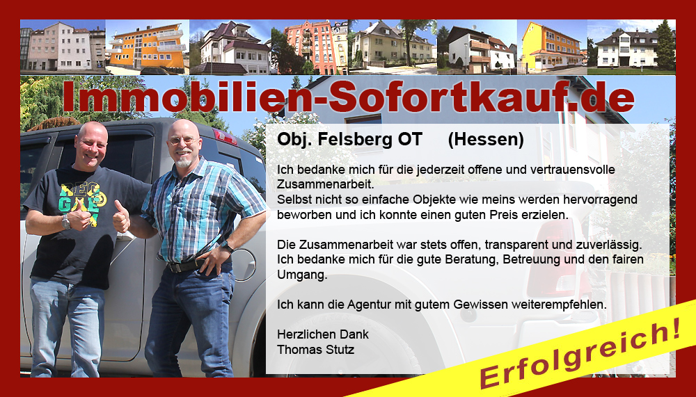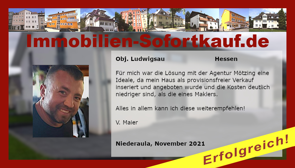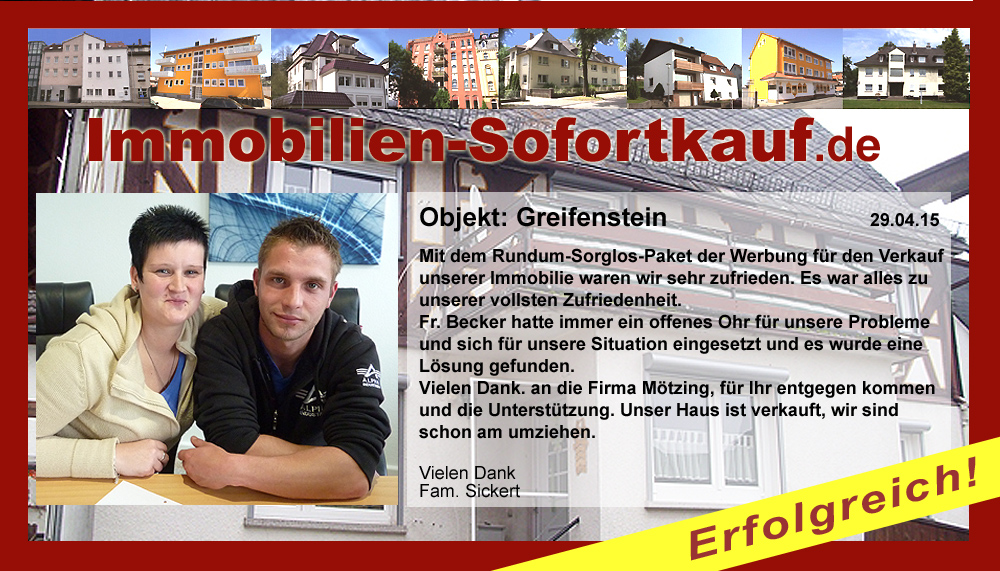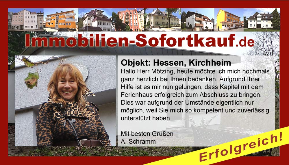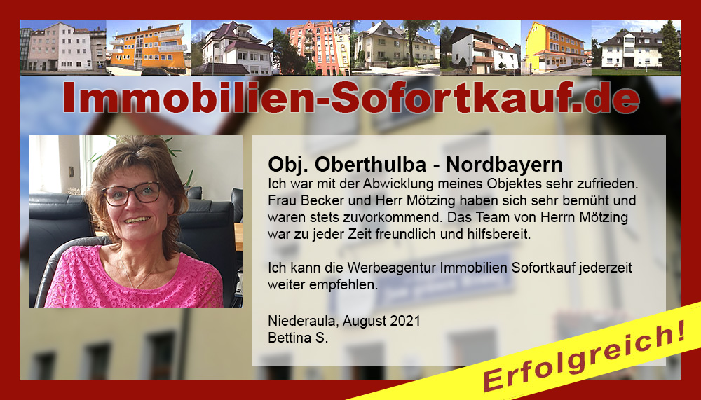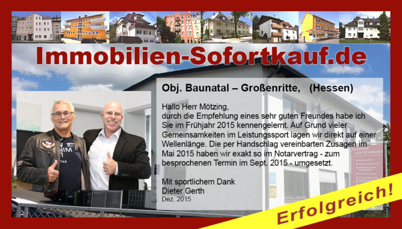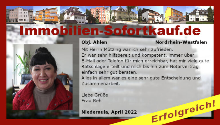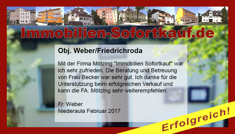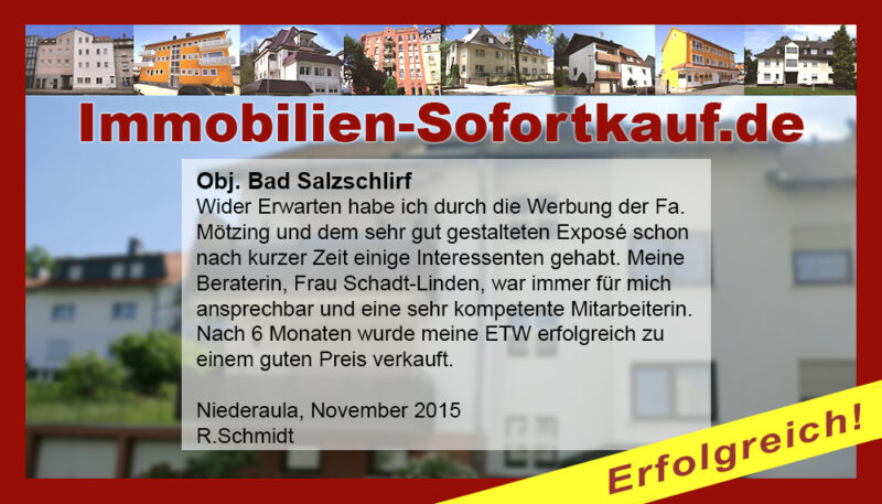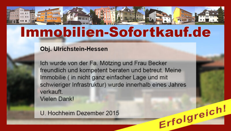 Die Fa. Mötzing „Immobilien-Sofortkauf“, kann ich ohne Bedenken weiter empfehlen. Mein Haus, in ländlicher Gegend habe ich nach 8 Monaten für einen guten Preis verkauft. Der Service, die Werbung und die gute Betreuung von Frau Becker, in dieser Zeit war hervorragend. Vielen Dank! Herr P. – Heringen Niederaula, Juli 2016