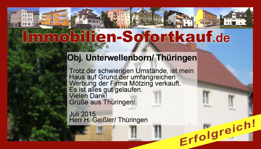 Trotz der schwierigen Umstände, ist mein Haus auf Grund der umfangreichen Werbung der Firma Mötzing verkauft. Es ist alles gut gelaufen. Vielen Dank! Grüße aus Thüringen! Juli 2015 Herr H. Geißler/ Thüringen