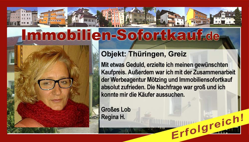 Mit etwas Geduld, erzielte ich meinen gewünschten Kaufpreis. Außerdem war ich mit der Zusammenarbeit der Werbeagentur Mötzing und Immobiliensofortkauf absolut zufrieden. Die Nachfrage war groß und ich konnte mir die Käufer aussuchen. Großes Lob Regina H.