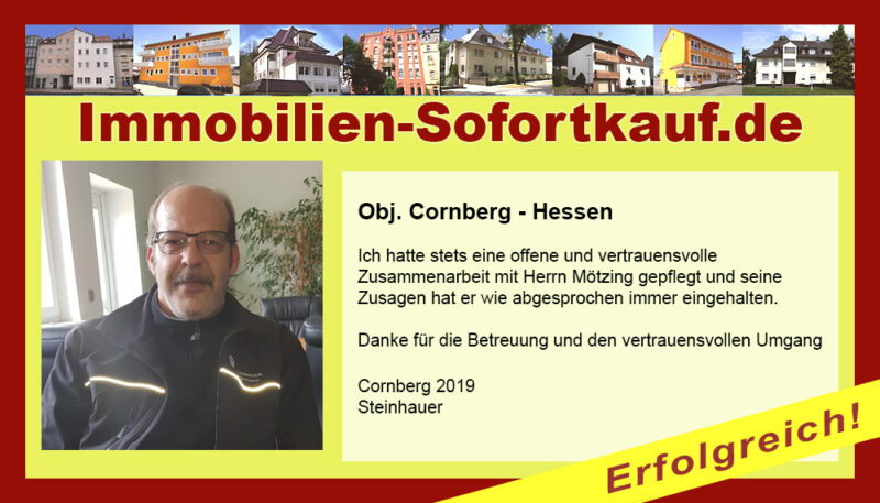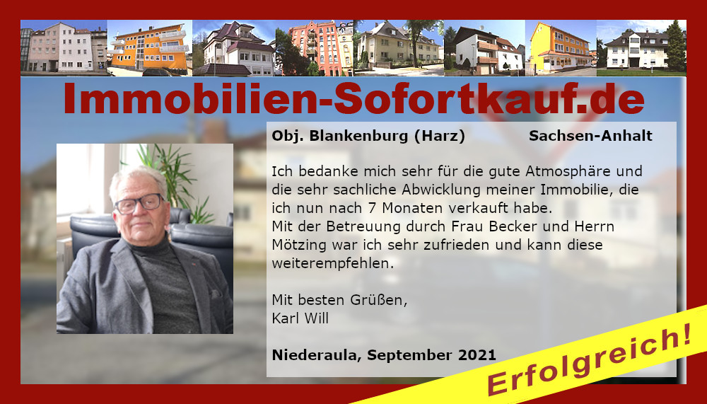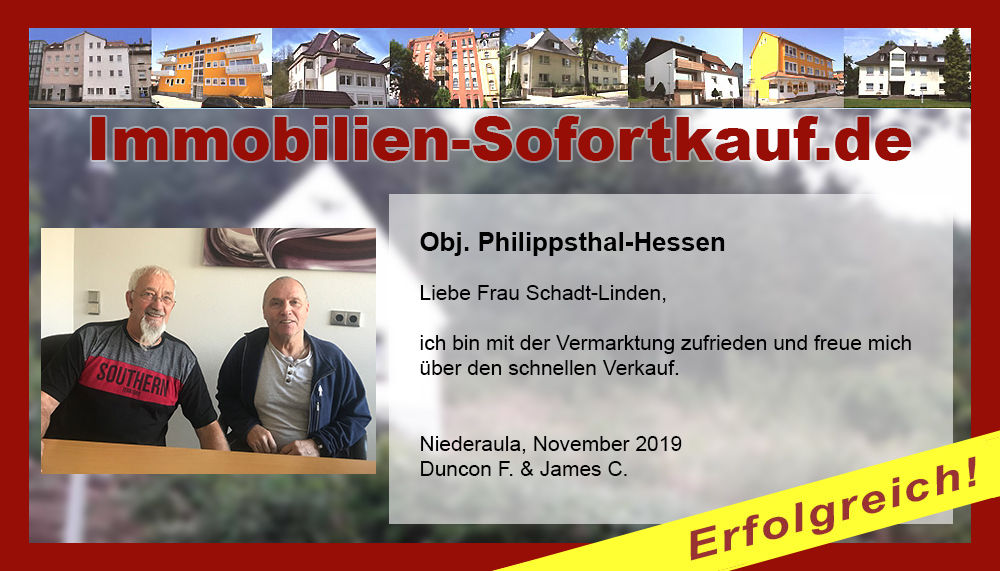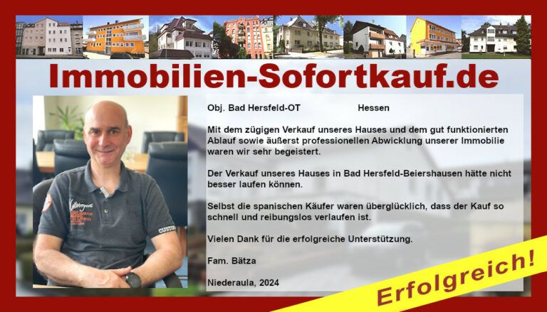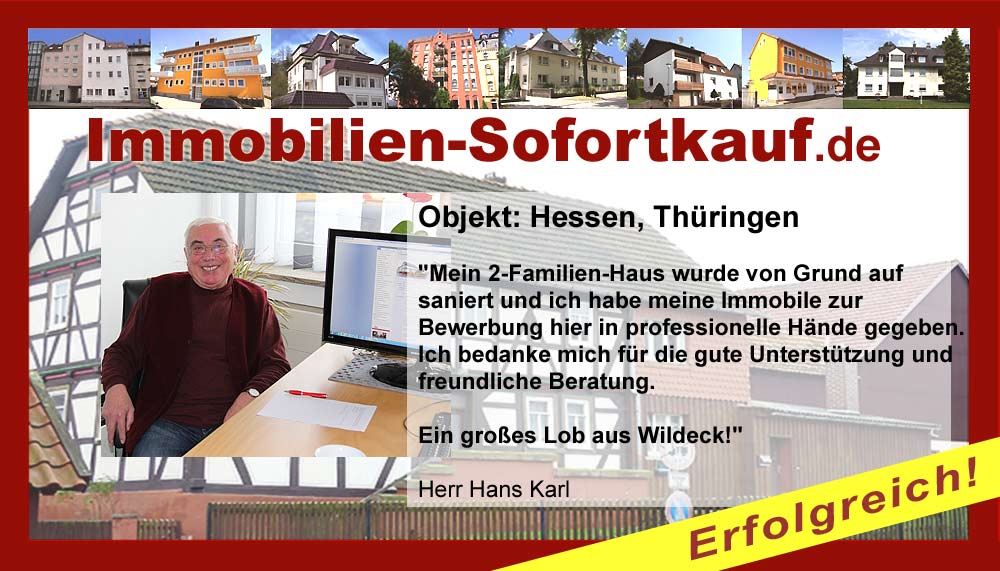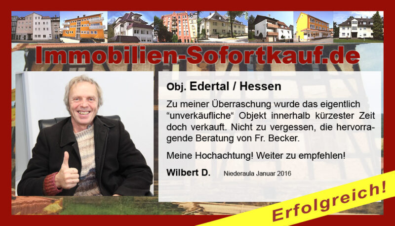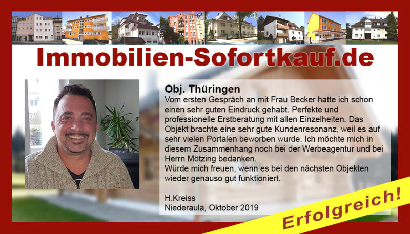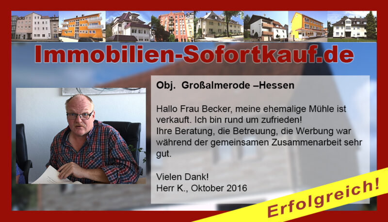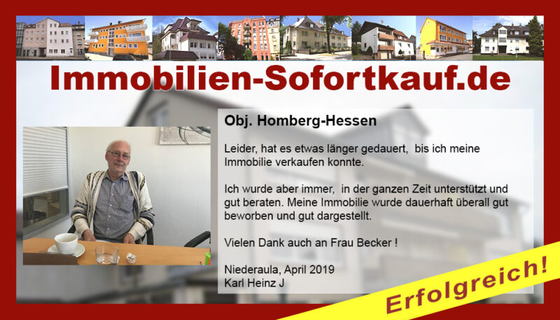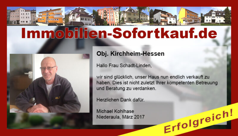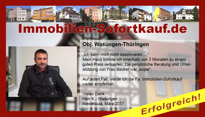 „Ich kann mich nicht beschweren….“ Mein Haus konnte ich innerhalb von 3 Monaten zu einem guten Preis verkaufen. Die persönliche Beratung und Unterstützung von Frau Becker war „super“. Auf jeden Fall, werde ich die Fa. Immobilien-Sofortkauf weiter empfehlen. Vielen Dank Herr K.- Wasungen Niederaula, März 2017