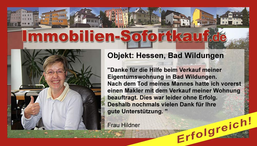 „Danke für die Hilfe beim Verkauf meiner Eigentumswohnung in Bad Wildungen. Nach dem Tod meines Mannes hatte ich vorerst einen Makler mit dem Verkauf meiner Wohnung beauftragt. Dies war leider ohne Erfolg. Deshalb nochmals vielen Dank für Ihre gute Unterstützung.“ Frau Hildner