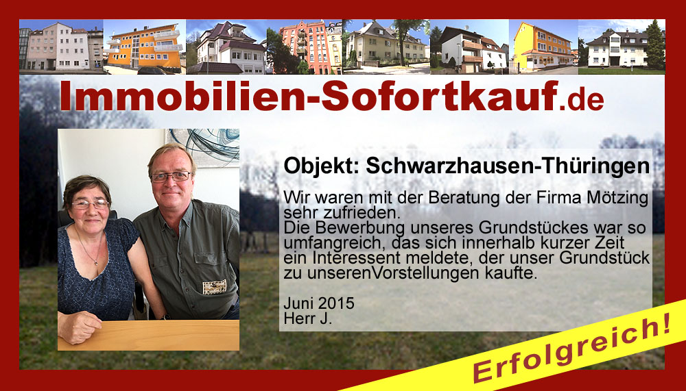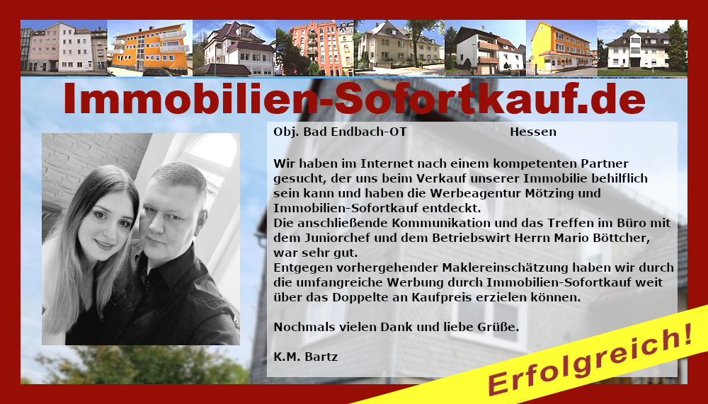 Wir haben im Internet nach einem kompetenten Partner gesucht, der uns beim Verkauf unserer Immobilie behilflich sein kann und haben die Werbeagentur Mötzing e. K. und Immobilien-Sofortkauf.de entdeckt. Die anschließende Kommunikation und das Treffen im Büro mit dem Juniorchef und dem Betriebswirt Herrn Mario Böttcher, war sehr gut. Entgegen vorhergehender Maklereinschätzung haben wir durch die umfangreiche Werbung durch Immobilien-Sofortkauf weit über das Doppelte an Kaufpreis erzielen können. Nochmals vielen Dank und liebe Grüße. K.M. Bartz