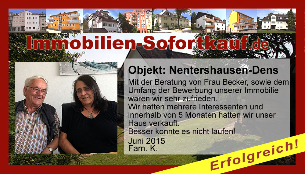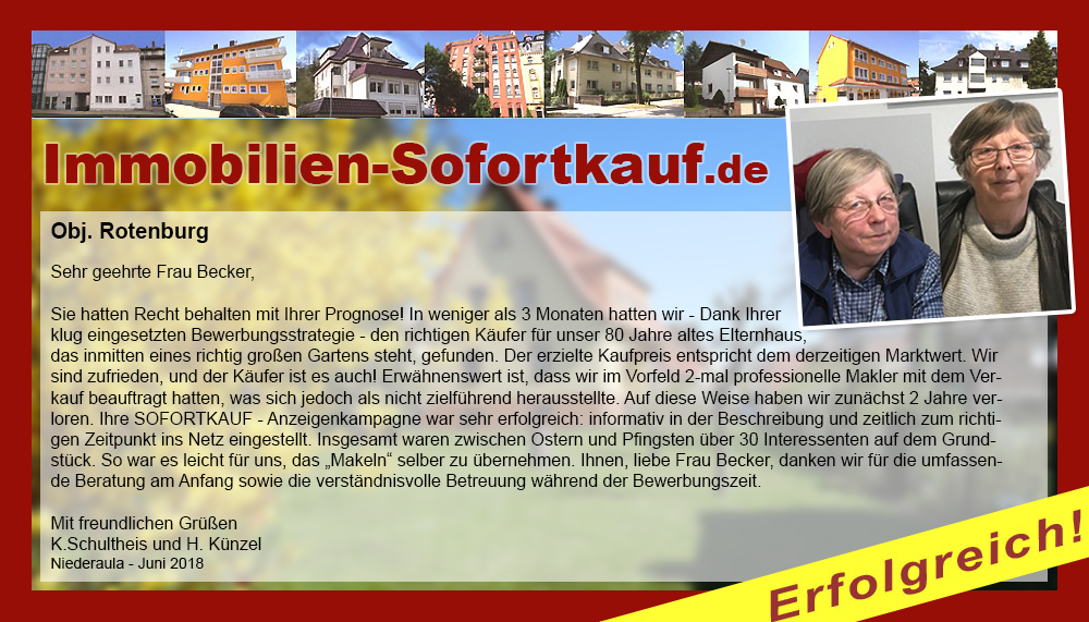 Sehr geehrte Frau Becker, Sie hatten Recht behalten mit Ihrer Prognose! In weniger als 3 Monaten hatten wir – Dank Ihrer klug eingesetzten Bewerbungsstrategie – den richtigen Käufer für unser 80 Jahre altes Elternhaus, das inmitten eines richtig großen Gartens steht, gefunden. Der erzielte Kaufpreis entspricht dem derzeitigen Marktwert. Wir sind zufrieden, und der Käufer ist es auch! Erwähnenswert ist, dass wir im Vorfeld 2-mal professionelle Makler mit dem Verkauf beauftragt hatten, was sich jedoch als nicht zielführend herausstellte. Auf diese Weise haben wir zunächst 2 Jahre verloren. Ihre SOFORTKAUF - Anzeigenkampagne war sehr erfolgreich: informativ in der Beschreibung und zeitlich zum richtigen Zeitpunkt ins Netz eingestellt. Insgesamt waren zwischen Ostern und Pfingsten über 30 Interessenten auf dem Grundstück. So war es leicht für uns, das „Makeln“ selber zu übernehmen. Ihnen, liebe Frau Becker, danken wir für die umfassende Beratung am Anfang sowie die verständnisvolle Betreuung während der Bewerbungszeit. Mit freundlichen Grüßen K. Schultheis und H. Künzel Niederaula - Juni 2018