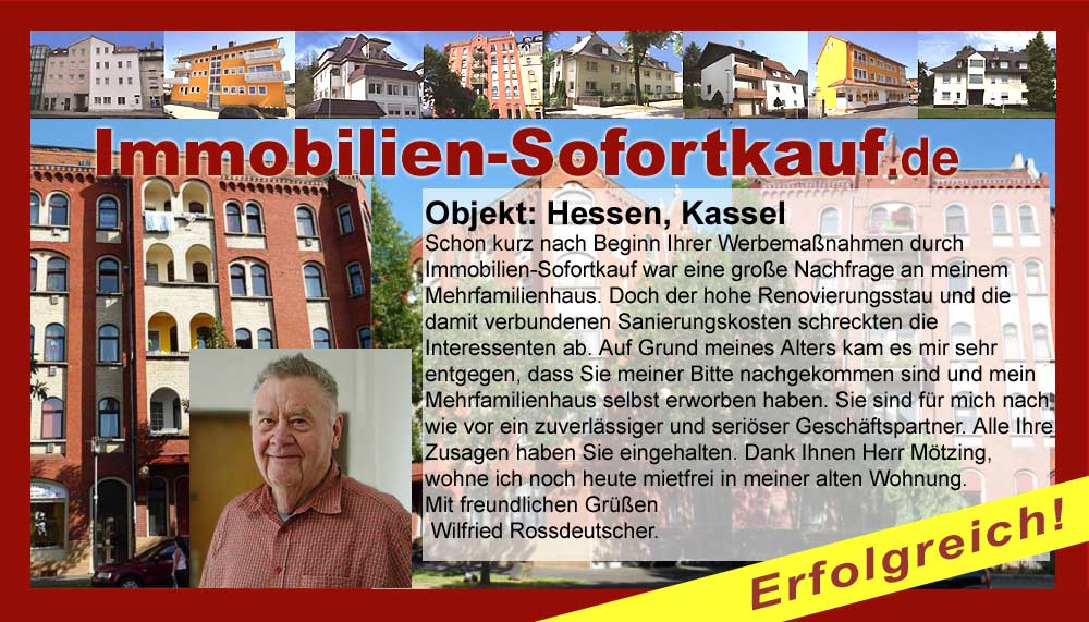 Schon kurz nach Beginn Ihrer Werbemaßnahmen durch Immobilien-Sofortkauf war eine große Nachfrage an meinem Mehrfamilienhaus. Doch der hohe Renovierungsstau und die damit verbundenen Sanierungskosten schreckten die Interessenten ab. Auf Grund meines Alters kam es mir sehr entgegen, dass Sie meiner Bitte nachgekommen sind und mein Mehrfamilienhaus selbst erworben haben. Sie sind für mich nach wie vor ein zuverlässiger und seriöser Geschäftspartner. Alle Ihre Zusagen haben Sie eingehalten. Dank Ihnen Herr Mötzing, wohne ich noch heute mietfrei in meiner alten Wohnung. Mit freundlichen Grüßen Wilfried Rossdeutscher