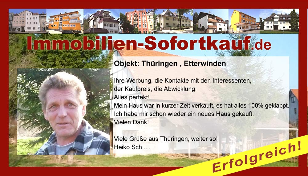 Ihre Werbung, die Kontakte mit den Interessenten, der Kaufpreis, die Abwicklung: Alles perfekt! Mein Haus war in kurzer Zeit verkauft, es hat alles 100% geklappt. Ich habe mir schon wieder ein neues Haus gekauft. Vielen Dank! Viele Grüße aus Thüringen, weiter so! Heiko Sch…..