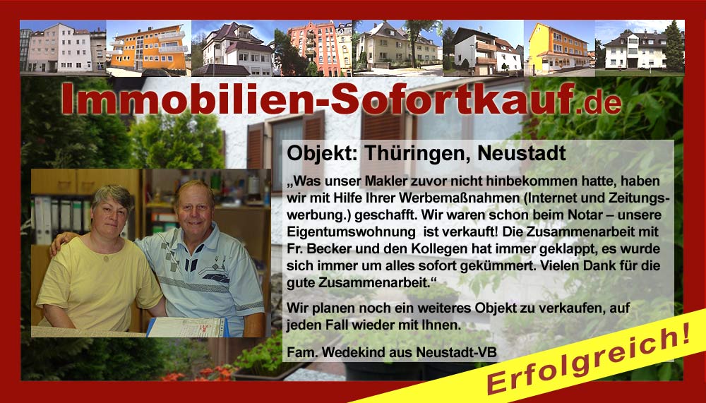 „Was unser Makler zuvor nicht hinbekommen hatte, haben wir mit Hilfe Ihrer Werbemaßnahmen (Internet und Zeitungswerbung.) geschafft. Wir waren schon beim Notar – unsere Eigentumswohnung ist verkauft! Die Zusammenarbeit mit Fr. Becker und den Kollegen hat immer geklappt, es wurde sich immer um alles sofort gekümmert. Vielen Dank für die gute Zusammenarbeit.“ Wir planen noch ein weiteres Objekt zu verkaufen, auf jeden Fall wieder mit Ihnen. Fam. Wedekind aus Neustadt-VB