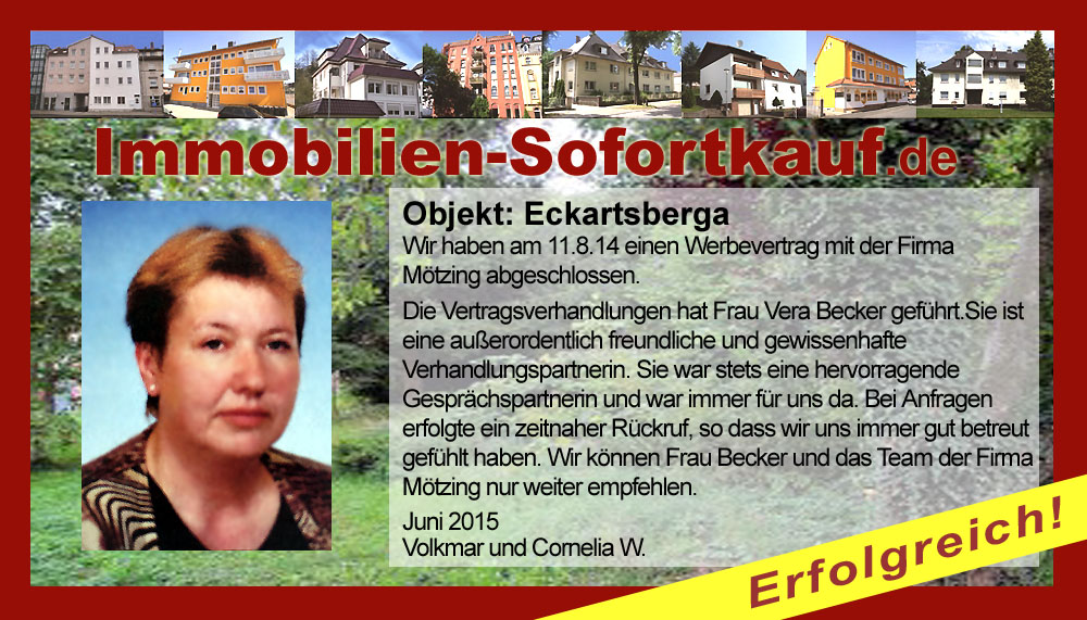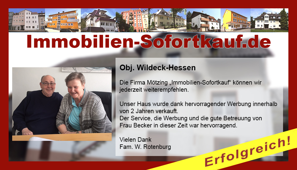 Die Firma Mötzing "Immobilien-Sofortkauf" können wir jederzeit weiterempfehlen. Unser Haus wurde dank hervorragender Werbung innerhalb von 2 Jahren verkauft. Der Service, die Werbung und die gute Betreuung von Frau Becker in dieser Zeit war hervorragend. Vielen Dank Fam. W. Rotenburg