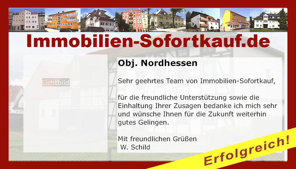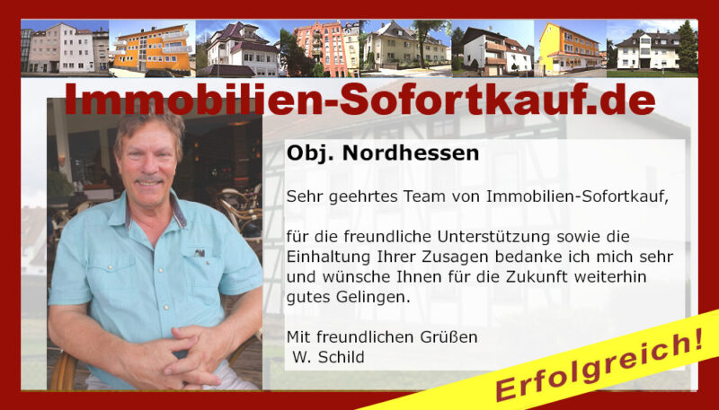 Sehr geehrtes Team von Immobilien-Sofortkauf, für die freundliche Unterstützung sowie die Einhaltung Ihrer Zusagen bedanke ich mich sehr und wünsche Ihnen für die Zukunft weiterhin gutes Gelingen. Mit freundlichen Grüßen W. Schild