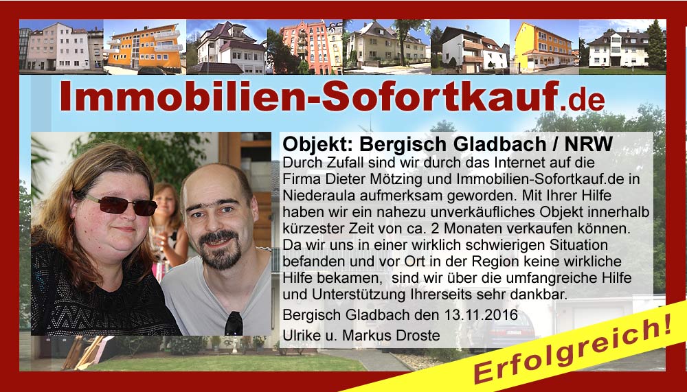 Durch Zufall sind wir durch das Internet auf die Firma Dieter Mötzing und Immobilien-Sofortkauf.de in Niederaula aufmerksam geworden. Mit Ihrer Hilfe haben wir ein nahezu unverkäufliches Objekt innerhalb kürzester Zeit von ca. 2 Monaten verkaufen können. Da wir uns in einer wirklich schwierigen Situation befanden und vor Ort in der Region keine wirkliche Hilfe bekamen, sind wir über die umfangreiche Hilfe und Unterstützung Ihrerseits sehr dankbar. Bergisch Gladbach den 13.11.2016 Ulrike u. Markus Droste