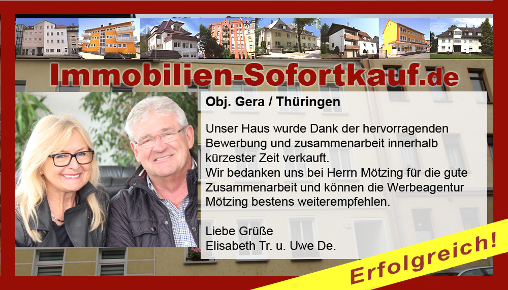 Unser Haus wurde Dank der hervorragenden Bewerbung und zusammenarbeit innerhalb kürzester Zeit verkauft. Wir bedanken uns bei Herrn Mötzing für die gute Zusammenarbeit und können die Werbeagentur Mötzing bestens weiterempfehlen. Liebe Grüße Elisabeth Tr. u. Uwe De.
