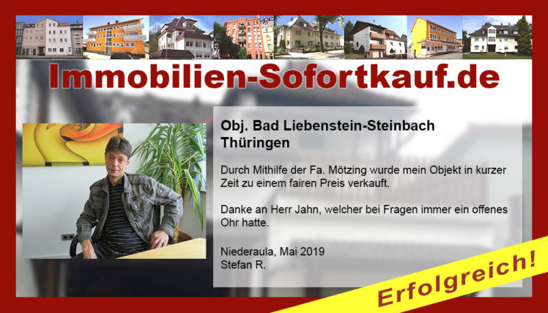 Durch Mithilfe der Fa. Mötzing wurde mein Objekt in kurzer Zeit zu einem fairen Preis verkauft. Danke an Herr Jahn, welcher bei Fragen immer ein offenes Ohr hatte. Niederaula, Mai 2019 Stefan R.
