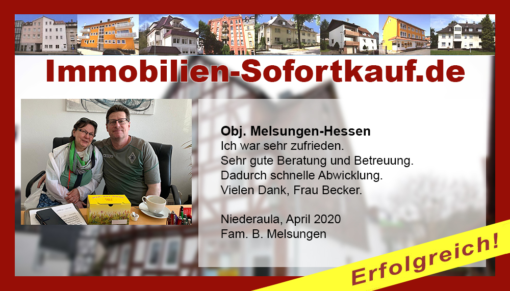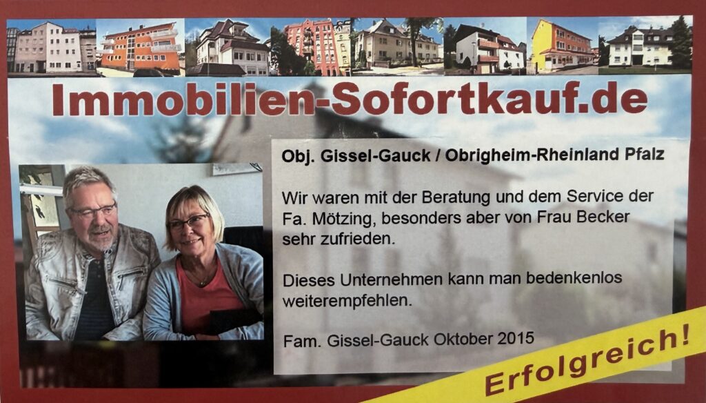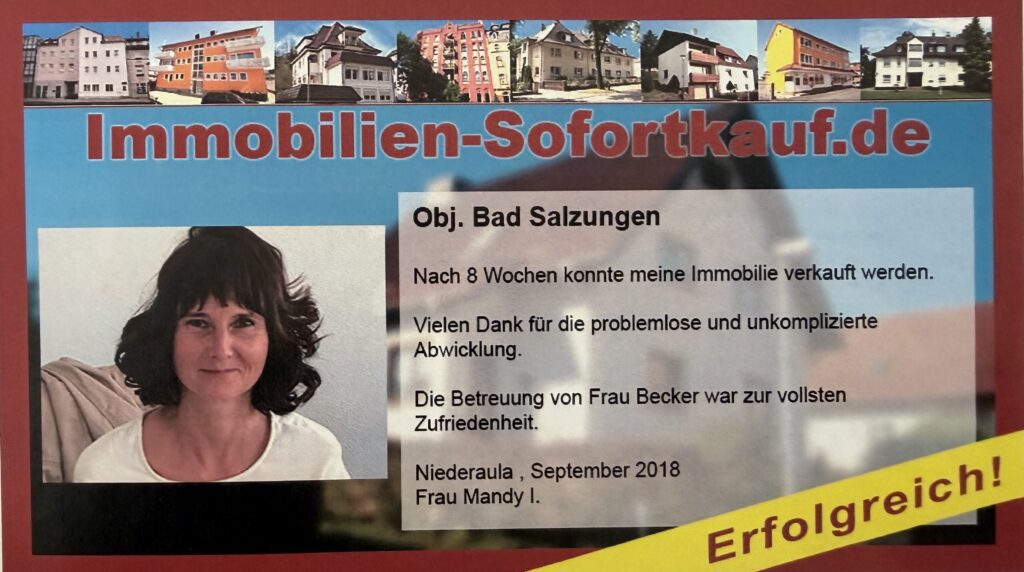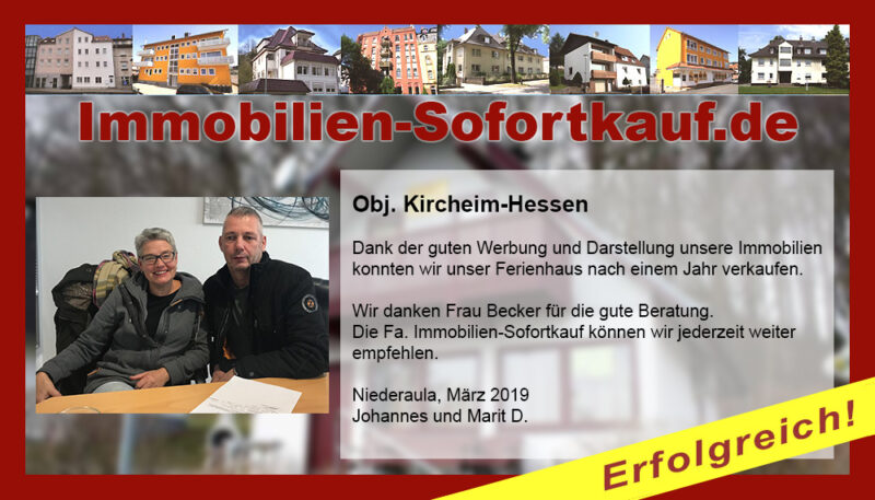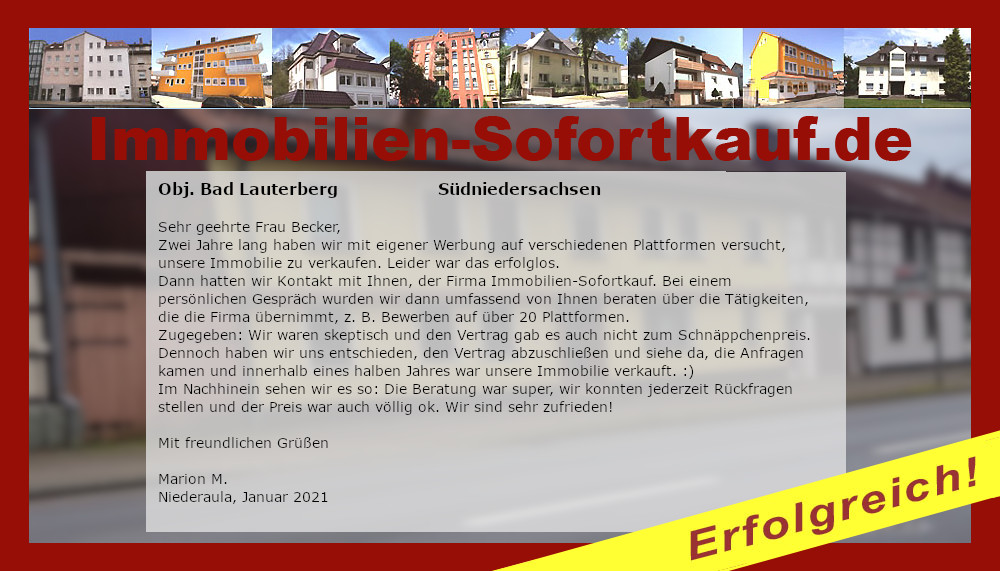 Sehr geehrte Frau Becker, Zwei Jahre lang haben wir mit eigener Werbung auf verschiedenen Plattformen versucht, unsere Immobilie zu verkaufen. Leider war das erfolglos. Dann hatten wir Kontakt mit Ihnen, der Firma Immobilien-Sofortkauf. Bei einem persönlichen Gespräch wurden wir dann umfassend von Ihnen beraten über die Tätigkeiten, die die Firma übernimmt, z. B. Bewerben auf über 20 Plattformen. Zugegeben: Wir waren skeptisch und den Vertrag gab es auch nicht zum Schnäppchenpreis. Dennoch haben wir uns entschieden, den Vertrag abzuschließen und siehe da, die Anfragen kamen und innerhalb eines halben Jahres war unsere Immobilie verkauft. 🙂 Im Nachhinein sehen wir es so: Die Beratung war super, wir konnten jederzeit Rückfragen stellen und der Preis war auch völlig ok. Wir sind sehr zufrieden! Mit freundlichen Grüßen Marion M. Niederaula, Januar 2021