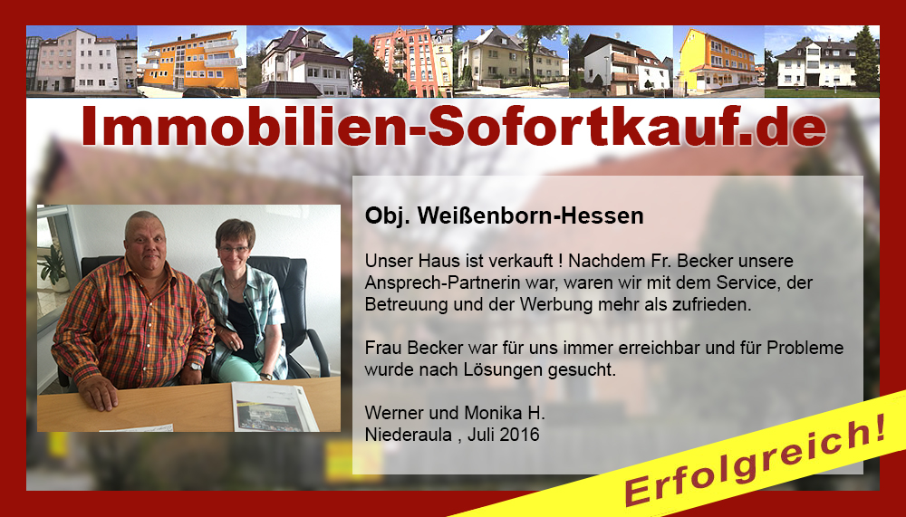 Unser Haus ist verkauft ! Nachdem Fr. Becker unsere Ansprech-Partnerin war, waren wir mit dem Service, der Betreuung und der Werbung mehr als zufrieden. Frau Becker war für uns immer erreichbar und für Probleme wurde nach Lösungen gesucht. Werner und Monika H. Niederaula, Juli 2016
