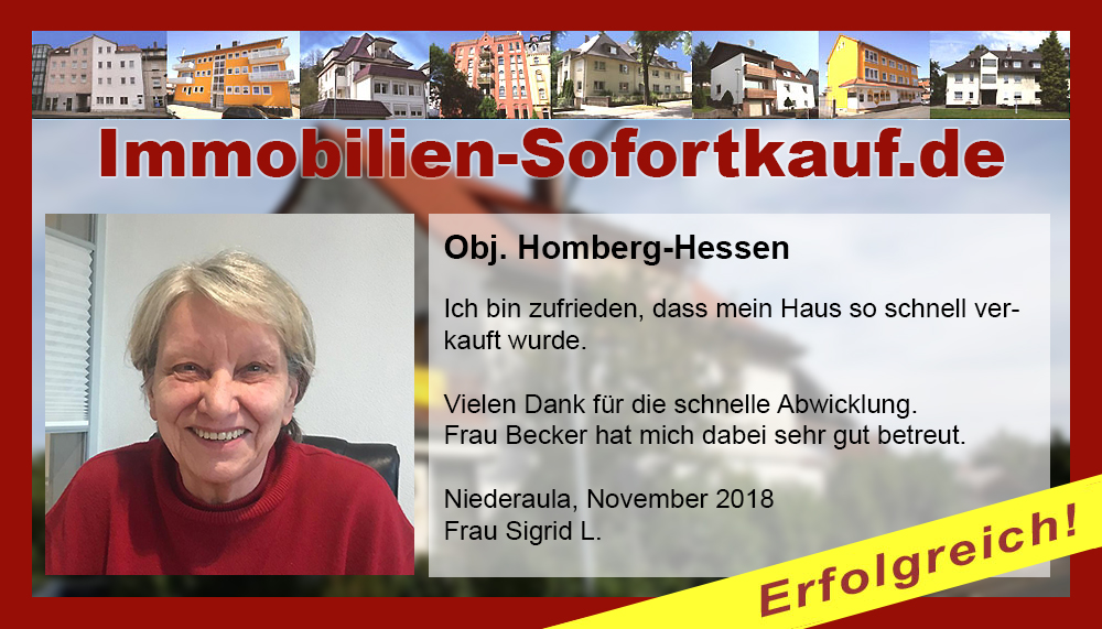 Ich bin zufrieden, dass mein Haus so schnell verkauft wurde. Vielen Dank für die schnelle Abwicklung. Frau Becker hat mich dabei sehr gut betreut. Niederaula, November 2018 Frau Sigrid L.