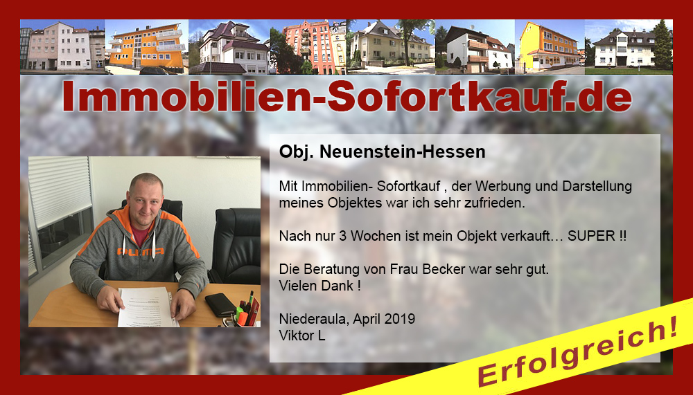 Mit Immobilien- Sofortkauf , der Werbung und Darstellung meines Objektes war ich sehr zufrieden. Nach nur 3 Wochen ist mein Objekt verkauft… SUPER !! Die Beratung von Frau Becker war sehr gut. Vielen Dank ! Niederaula, April 2019 Viktor L