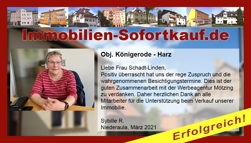 Liebe Frau Schadt-Linden, Positiv überrascht hat uns der rege Zuspruch und die wahrgenommenen Besichtigungstermine. Dies ist der guten Zusammenarbeit mit der Werbeagentur Mötzing zu verdanken. Daher herzlichen Dank an alle Mitarbeiter für die Unterstützung beim Verkauf unserer Immobilie. Sybille R. Niederaula, März 2021