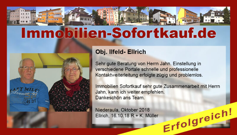 Sehr gute Beratung von Herrn Jahn. Einstellung in verschiedene Portale schnelle und professionelle Kontaktweiterleitung erfolgte zügig und problemlos. Immobilien Sofortkauf sehr gute Zusammenarbeit mit Herrn Jahn, kann ich weiter empfehlen. Dankeschön ans Team. Niederaula, Oktober 2018 Ellrich, 16.10.18 R.+ K. Müller