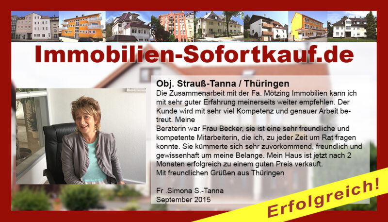 Die Zusammenarbeit mit der Fa. Mötzing Immobilien kann ich mit sehr guter Erfahrung meinerseits weiter empfehlen. Der Kunde wird mit sehr viel Kompetenz und genauer Arbeit betreut. Meine Beraterin war Frau Becker, sie ist eine sehr freundliche und kompetente Mitarbeiterin, die ich zu jeder Zeit um Rat fragen konnte. Sie kümmerte sich sehr zuvorkommend, freundlich und gewissenhaft um meine Belange. Mein Haus ist jetzt nach 2 Monaten erfolgreich zu einem guten Preis verkauft. Mit freundlichen Grüßen aus Thüringen Fr. Simona S.-Tanna September 2015