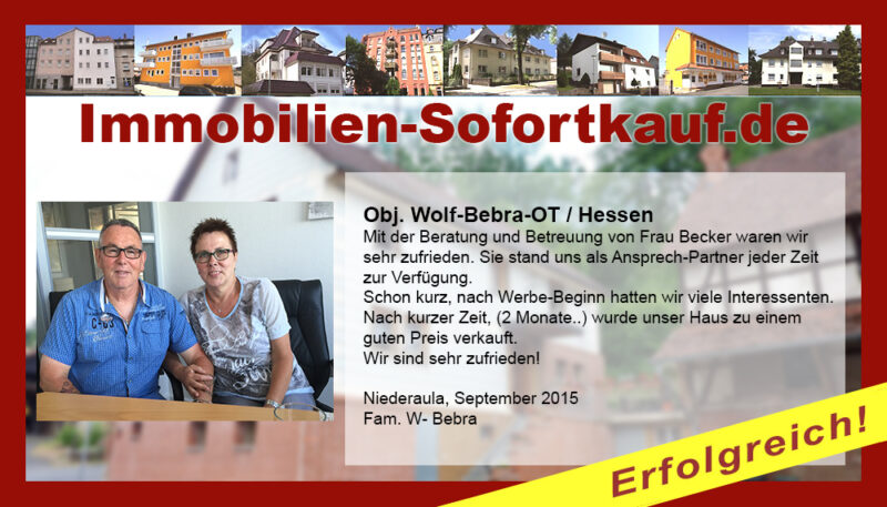 Mit der Beratung und Betreuung von Frau Becker waren wir sehr zufrieden. Sie stand uns als Ansprech-Partner jeder Zeit zur Verfügung. Schon kurz, nach Werbe-Beginn hatten wir viele Interessenten. Nach kurzer Zeit, (2 Monate..) wurde unser Haus zu einem guten Preis verkauft. Wir sind sehr zufrieden! Niederaula, September 2015 Fam. W.-Bebra