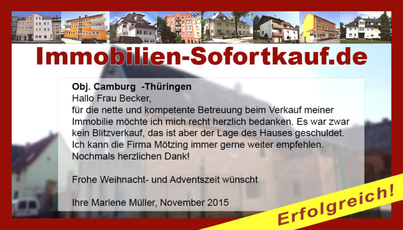 Hallo Frau Becker, für die nette und kompetente Betreuung beim Verkauf meiner Immobilie möchte ich mich recht herzlich bedanken. Es war zwar kein Blitzverkauf, das ist aber der Lage des Hauses geschuldet. Ich kann die Firma Mötzing immer gerne weiter empfehlen. Nochmals herzlichen Dank! Frohe Weihnacht- und Adventszeit wünscht Ihre Marlene Müller, November 2015