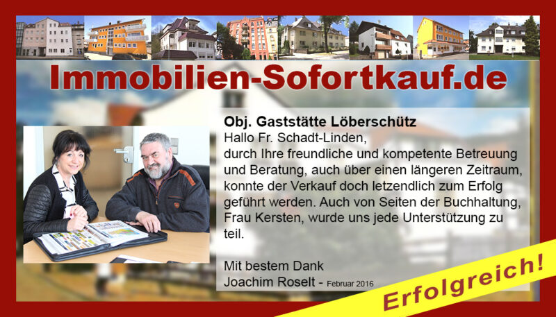 Hallo Fr. Schadt-Linden, durch Ihre freundliche und kompetente Betreuung und Beratung, auch über einen längeren Zeitraum, konnte der Verkauf doch letztendlich zum Erfolg geführt werden. Auch von Seiten der Buchhaltung, Frau Kersten, wurde uns jede Unterstützung zu teil. Mit bestem Dank Joachim Roselt – Februar 2016