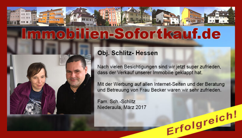 Nach vielen Besichtigungen sind wir jetzt super zufrieden, dass der Verkauf unserer Immobilie geklappt hat. Mit der Werbung auf allen Internet-Seiten und der Beratung und Betreuung von Frau Becker waren wir sehr zufrieden. Fam. Sch.-Schlitz Niederaula, März 2017
