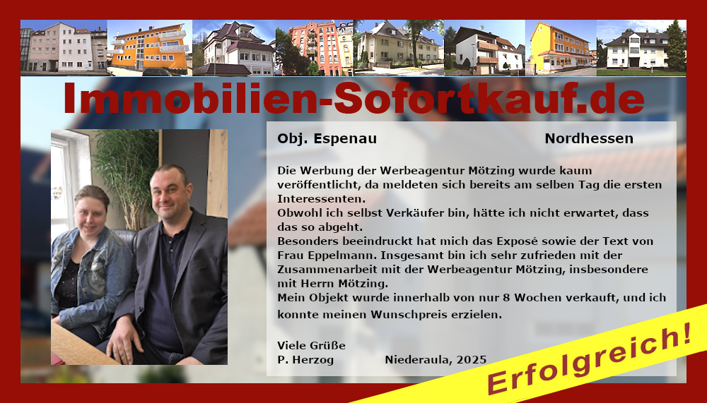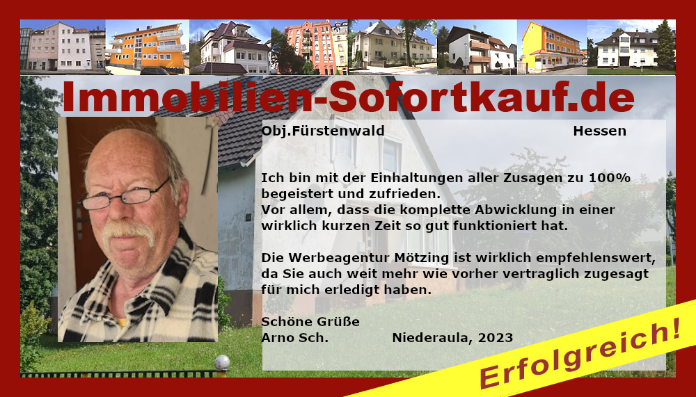 Dank der Werbeagentur Mötzing konnte ich meine Immobilie in einem überschaubaren Zeitraum und zu einem für mich passenden Preis verkaufen. Die gesamte Abwicklung war bis zur finalen Vertragsabwicklung sehr zufriedenstellend, weshalb ich die Zusammenarbeit mit Immobilien-Sofortkauf.de jedem Immobilienverkäufer weiterempfehlen kann. Viele Grüße, F. Westermann Niederaula, Juli 2024