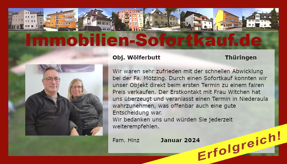 Wir waren sehr zufrieden mit der schnellen Abwicklung bei der Fa. Mötzing. Durch einen Sofortankauf konnten wir unser Objekt direkt beim ersten Termin zu einem fairen Preis verkaufen. Der Erstkontakt mit Frau Witchen hat uns überzeugt und veranlasst einen Termin in Niederaula wahrzunehmen, was offenbar auch eine gute Entscheidung war. Wir bedanken uns und würden Sie jederzeit weiterempfehlen. Fam. Hinz Januar 2024