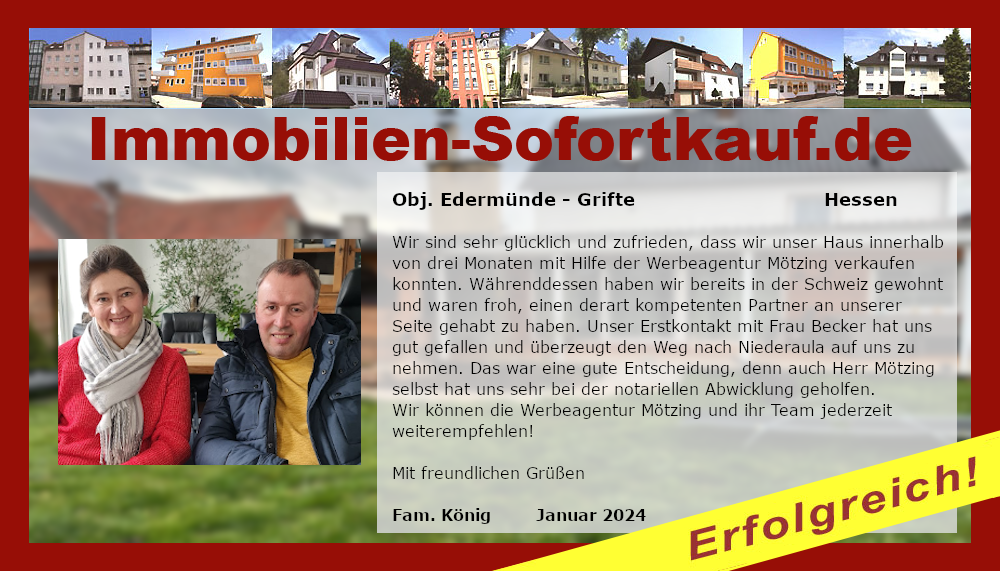 Wir sind sehr glücklich und zufrieden, dass wir unser Haus innerhalb von drei Monaten mit Hilfe der Werbeagentur Mötzing verkaufen konnten. Währenddessen haben wir bereits in der Schweiz gewohnt und waren froh, einen derart kompetenten Partner an unserer Seite gehabt zu haben. Unser Erstkontakt mit Frau Becker hat uns gut gefallen und überzeugt den Weg nach Niederaula auf uns zu nehmen. Das war eine gute Entscheidung, denn auch Herr Mötzing selbst hat uns sehr bei der notariellen Abwicklung geholfen. Wir können die Werbeagentur Mötzing und ihr Team jederzeit weiterempfehlen! Mit freundlichen Grüßen Fam. König Januar 2024