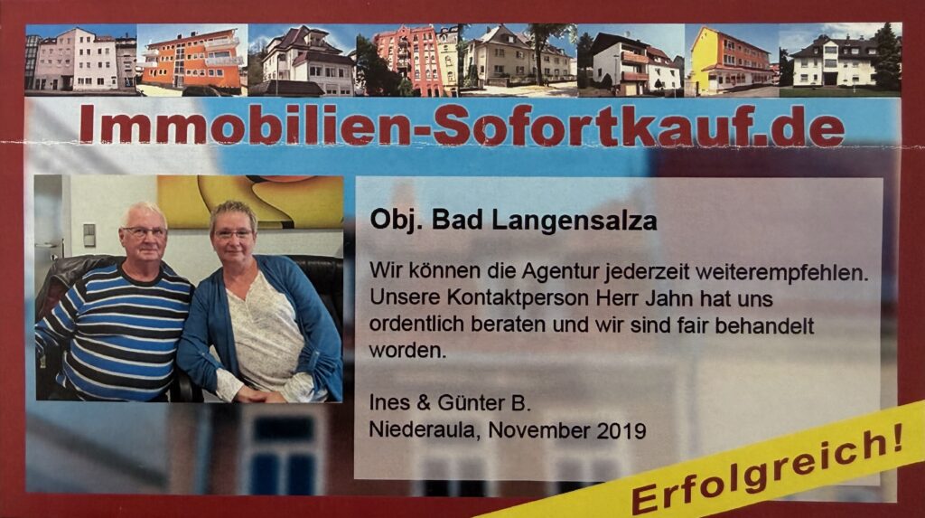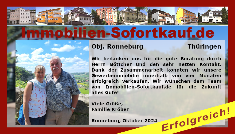 Wir bedanken uns für die gute Beratung durch Herrn Böttcher und den sehr netten Kontakt. Dank der Zusammenarbeit konnten wir unsere Gewerbeimmobilie innerhalb von vier Monaten erfolgreich verkaufen. Wir wünschen dem Team von Immobilien-Sofortkauf.de für die Zukunft alles Gute! Viele Grüße, Familie Kröber Ronneburg, Oktober 2024