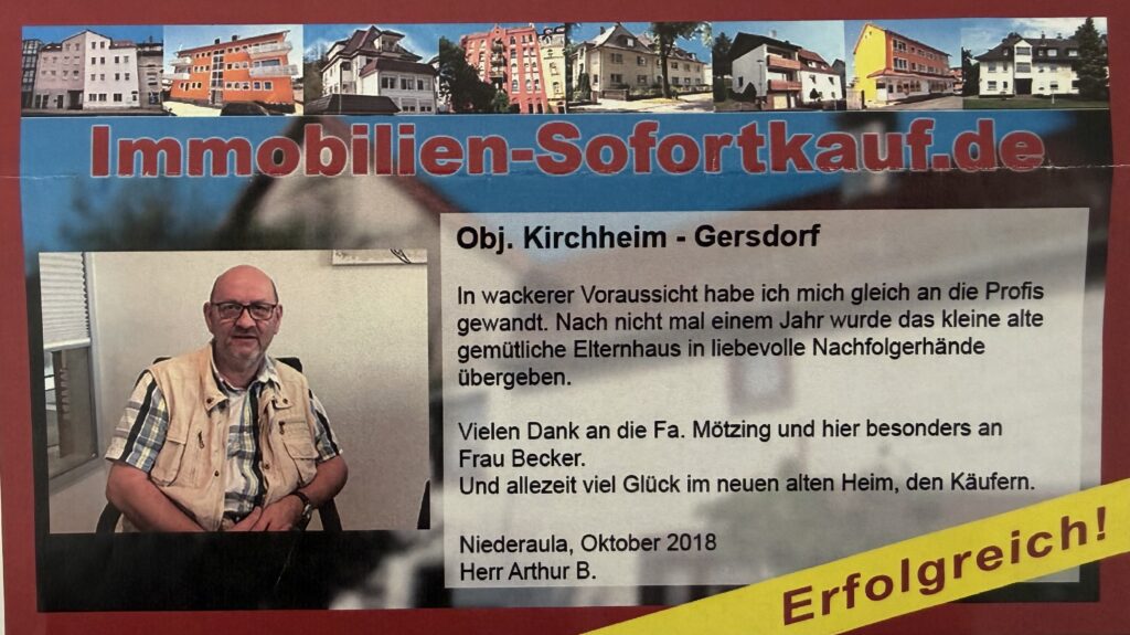 In wackerer Voraussicht habe ich mich gleich an die Profis gewandt. Nach nicht mal einem Jahr wurde das kleine alte gemütliche Elternhaus in liebevolle Nachfolgerhände übergeben. Vielen Dank an die Fa. Mötzing und hier besonders an Frau Becker. Und allezeit viel Glück in neuen alten Heim, den Käufern. Niederaula, Oktober 2018 Herr Arthur B