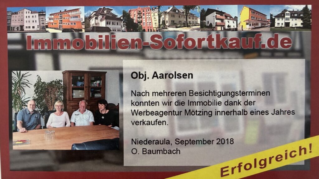 Dank der professionellen Unterstützung der Werbeagentur Mötzing konnten wir unser Objekt innerhalb von nur 6 Monaten verkaufen. Uns hat insbesondere das preiswerte Angebot der Werbedienstleistungen überzeugt, da diese deutlich günstiger waren als bei einem Makler. Der Kontakt war unkompliziert, wir hatten immer einen Ansprechpartner und die individuelle Marktwertanalyse vorab war durchaus zielführend. Insgesamt waren wir sehr zufrieden! Viele Grüße, Fam. Linke, Niederaula, März 2024