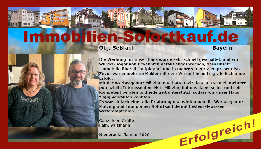 Die Werbung für unser Haus wurde sehr schnell geschaltet, und wir wurden sogar von Bekannten darauf angesprochen, dass unsere Immobilie überall „aufploppt" und in mehreren Portalen präsent ist. Zuvor waren mehrere Makler mit dem Verkauf beauftragt, jedoch ohne Erfolg. Mit der Werbeagentur Mötzing e. K. hatten wir dagegen schnell mehrere potenzielle Interessenten. Herr Mötzing hat uns dabei selbst und sehr kompetent beraten und jederzeit unterstützt, sodass wir unser Haus zügig verkaufen konnten. Es war einfach eine tolle Erfahrung und wir können die Werbeagentur Mötzing und Immobilien-Sofortkauf.de mit bestem Gewissen weiterempfehlen. Ganz liebe Grüße Fam. Salzmann Niederaula, Januar 2023