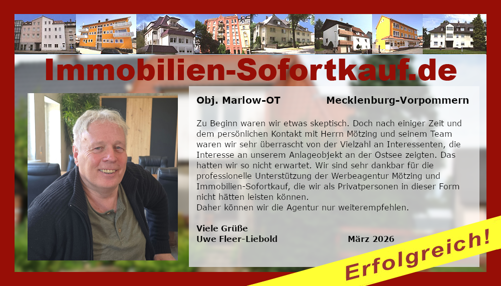 Zu Beginn waren wir etwas skeptisch. Doch nach einiger Zeit und dem persönlichen Kontakt mit Herrn Mötzing und seinem Team waren wir sehr überrascht von der Vielzahl an Interessenten, die Interesse an unserem Anlageobjekt an der Ostsee zeigten. Das hatten wir so nicht erwartet. Wir sind sehr dankbar für die professionelle Unterstützung der Werbeagentur Mötzing und Immobilien-Sofortkauf, die wir als Privatpersonen in dieser Form nicht hätten leisten können. Daher können wir die Agentur nur weiterempfehlen. Viele Grüße Uwe Fleer-Liebold März 2026