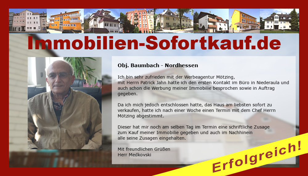 Ich bin sehr zufrieden mit der Werbeagentur Mötzing, mit Herr Patrick Jahn hatte ich den ersten Kontakt im Büro in Niederaula und auch schon die Werbung meiner Immobilie besprochen sowie in Auftrag gegeben. Da ich mich jedoch entschlossen hatte, das Haus am liebsten sofort zu verkaufen, hatte ich nach einer Woche einen Termin mit dem Chef Herrn Mötzing abgestimmt. Dieser hat mir noch am selben Tag im Termin eine schriftliche Zusage zum Kauf meiner Immobilie gegeben und auch im Nachhinein alle seine Zusagen eingehalten. Mit freundlichen Grüßen Herr Medkovski