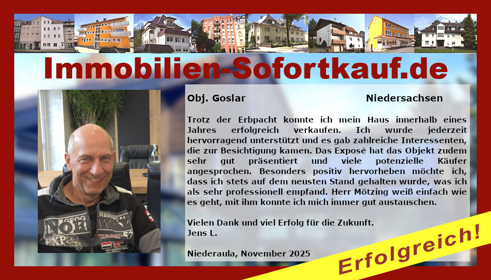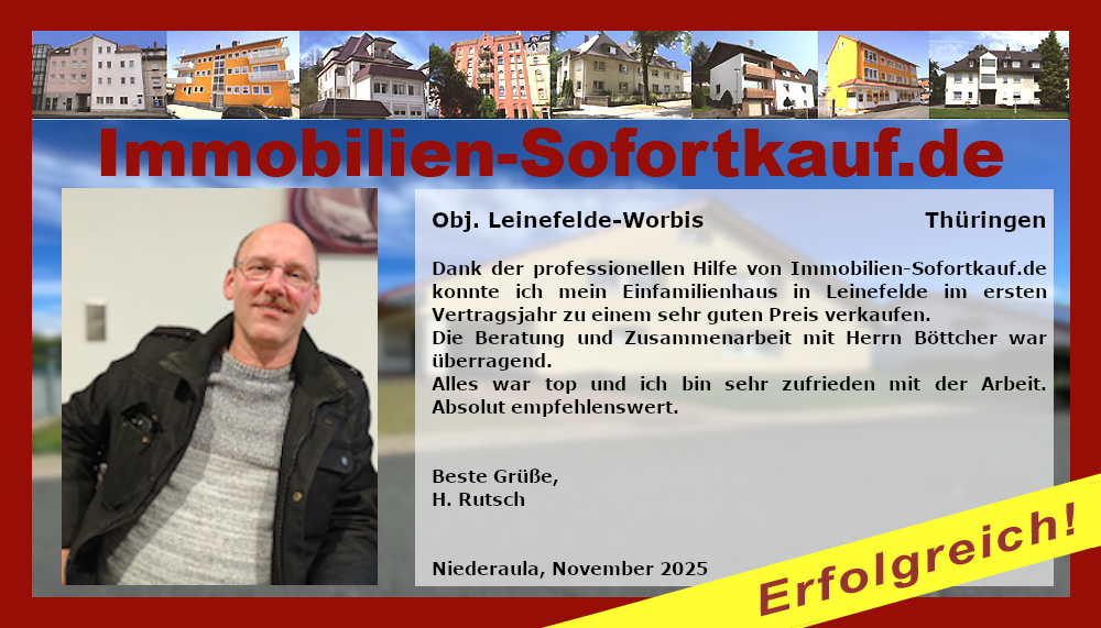 Dank der professionellen Hilfe von Immobilien-Sofortkauf.de konnte ich mein Einfamilienhaus in Leinefelde im ersten Vertragsjahr zu einem sehr guten Preis verkaufen. Die Beratung und Zusammenarbeit mit Herrn Böttcher war überragend. Alles war top und ich bin sehr zufrieden mit der Arbeit. Absolut empfehlenswert. Beste Grüße, H. Rutsch, Niederaula, November 2025