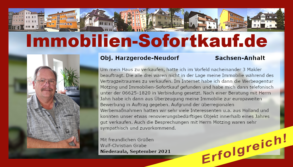 Um mein Haus zu verkaufen, hatte ich im Vorfeld nacheinander 3 Makler beauftragt. Die alle drei waren nicht in der Lage meine Immobilie während des Vertragzeitraumes zu verkaufen. Im Internet habe ich dann die Werbeagentur Mötzing und Immobilien-Sofortkauf gefunden und habe mich dann telefonisch unter der 06625-1820 in Verbindung gesetzt. Nach einer Beratung mit Herrn Jahn habe ich dann aus Überzeugung meine Immobilie zur europaweiten Bewerbung in Auftrag gegeben. Aufgrund der überregionalen Werbemaßnahmen hatten wir sehr viele Interessenten u.a. aus Holland und konnten unser etwas renovierungsbedürftiges Objekt innerhalb eines Jahres gut verkaufen. Auch die Besprechungen mit Herrn Mötzing waren sehr sympathisch und zuvorkommend. Mit freundlichen Grüßen Wulf-Christian Grabe Niederaula, September 2021