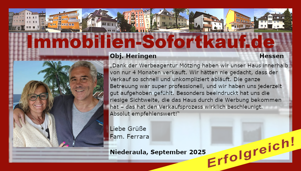 Dank der Werbeagentur Mötzing e. K. haben wir unser Haus innerhalb von nur 4 Monaten verkauft. Wir hätten nie gedacht, dass der Verkauf so schnell und unkompliziert abläuft. Die ganze Betreuung war super professionell, und wir haben uns jederzeit gut aufgehoben gefühlt. Besonders beeindruckt hat uns die riesige Sichtweite, die das Haus durch die Werbung bekommen hat - das hat den Verkaufsprozess wirklich beschleunigt. Absolut empfehlenswert! Liebe Grüße Fam. Ferrara Niederaula, September 2025