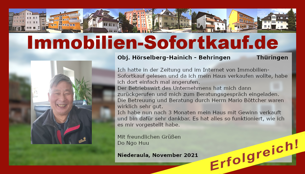 Ich hatte in der Zeitung und im Internet von Immobilien-Sofortkauf gelesen und da ich mein Haus verkaufen wollte, habe ich dort einfach mal angerufen. Der Betriebswirt des Unternehmens hat mich dann zurückgerufen und mich zum Beratungsgespräch eingeladen. Die Betreuung und Beratung durch Herrn Mario Böttcher waren wirklich sehr gut. Ich habe nun nach 3 Monaten mein Haus mit Gewinn verkauft und bin dafür sehr dankbar. Es hat alles so funktioniert, wie ich es mir vorgestellt habe. Mit freundlichen Grüßen Do Ngo Huu Niederaula, November 2021