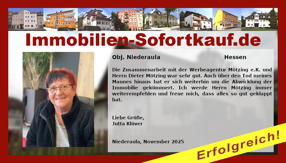 Die Zusammenarbeit mit der Werbeagentur Mötzing e. K. und Herrn Dieter Mötzing war sehr gut. Auch über den Tod meines Mannes hinaus hat er sich weiterhin um die Abwicklung der Immobilie gekümmert. Ich werde Herr Mötzing immer weiterempfehlen und freue mich, dass alles so gut geklappt hat. Liebe Grüße, Jutta Klüver Niederaula, November 2025