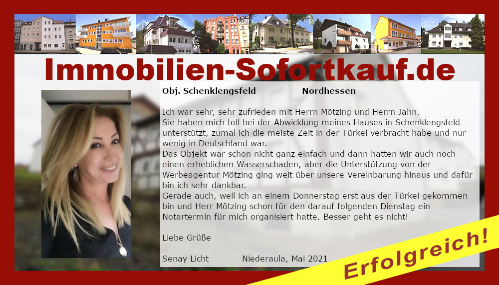 Ich war sehr, sehr zufrieden mit Herrn Mötzing und Herrn Jahn. Sie haben mich toll bei der Abwicklung meines Hauses in Schenklengsfeld unterstützt, zumal ich die meiste Zeit in der Türkei verbracht habe und nur wenig in Deutschland war. Das Objekt war schon nicht ganz einfach und dann hatten wir auch noch einen erheblichen Wasserschaden, aber die Unterstützung von der Werbeagentur Mötzing ging weit über unsere Vereinbarung hinaus und dafür bin ich sehr dankbar. Gerade auch, weil ich an einem Donnerstag erst aus der Türkei gekommen bin und Herr Mötzing schon für den darauf folgenden Dienstag ein Notartermin für mich organisiert hatte. Besser geht es nicht! Liebe Grüße Senay Licht Niederaula, Mai 2021