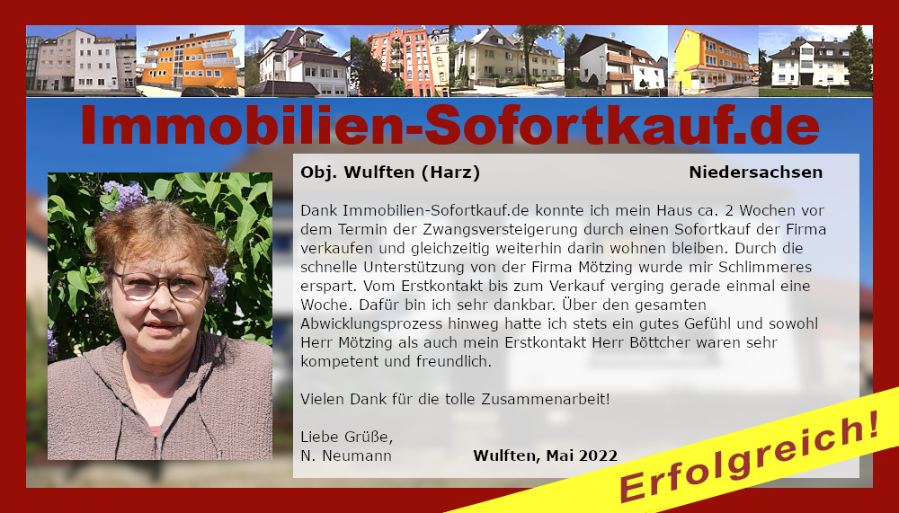 Dank Immobilien-Sofortkauf.de konnte ich mein Haus ca. 2 Wochen vor dem Termin der Zwangsversteigerung durch einen Sofortkauf der Firma verkaufen und gleichzeitig weiterhin darin wohnen bleiben. Durch die schnelle Unterstützung von der Firma Mötzing wurde mir Schlimmeres erspart. Vom Erstkontakt bis zum Verkauf verging gerade einmal eine Woche. Dafür bin ich sehr dankbar. Über den gesamten Abwicklungsprozess hinweg hatte ich stets ein gutes Gefühl und sowohl Herr Mötzing als auch mein Erstkontakt Herr Böttcher waren sehr kompetent und freundlich. Vielen Dank für die tolle Zusammenarbeit! Liebe Grüße, N. Neumann Wulften, Mai 2022