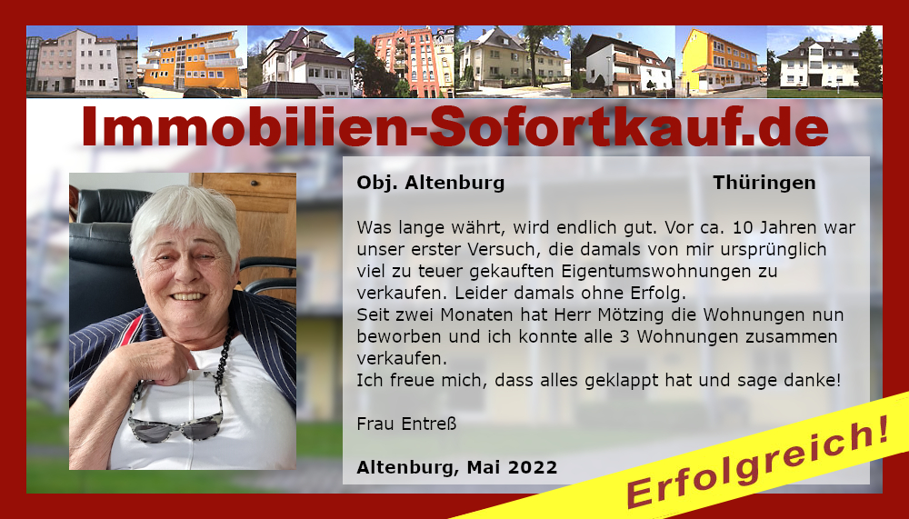 Was lange währt, wird endlich gut. Vor ca. 10 Jahren war unser erster Versuch, die damals von mir ursprünglich viel zu teuer gekauften Eigentumswohnungen zu verkaufen. Leider damals ohne Erfolg. Seit zwei Monaten hat Herr Mötzing die Wohnungen nun beworben und ich konnte alle 3 Wohnungen zusammen verkaufen. Ich freue mich, dass alles geklappt hat und sage danke! Frau Entreß Altenburg, Mai 2022